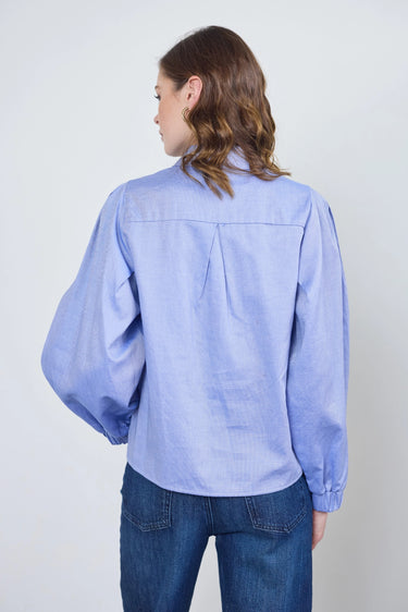 Chemise Henriette en coton Oxford, lumineuse et raffinée. Manches bouffantes et strass au col pour un style féminin, chic et original.