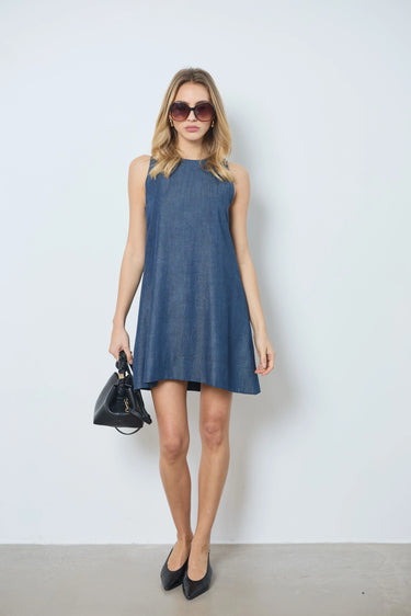 Apportez une touche décontractée à votre été avec cette petite robe trapèze en denim brut. Sans manches et à col rond, elle est légère et idéale pour les journées ensoleillées.