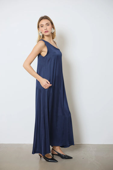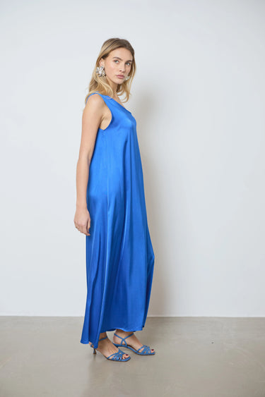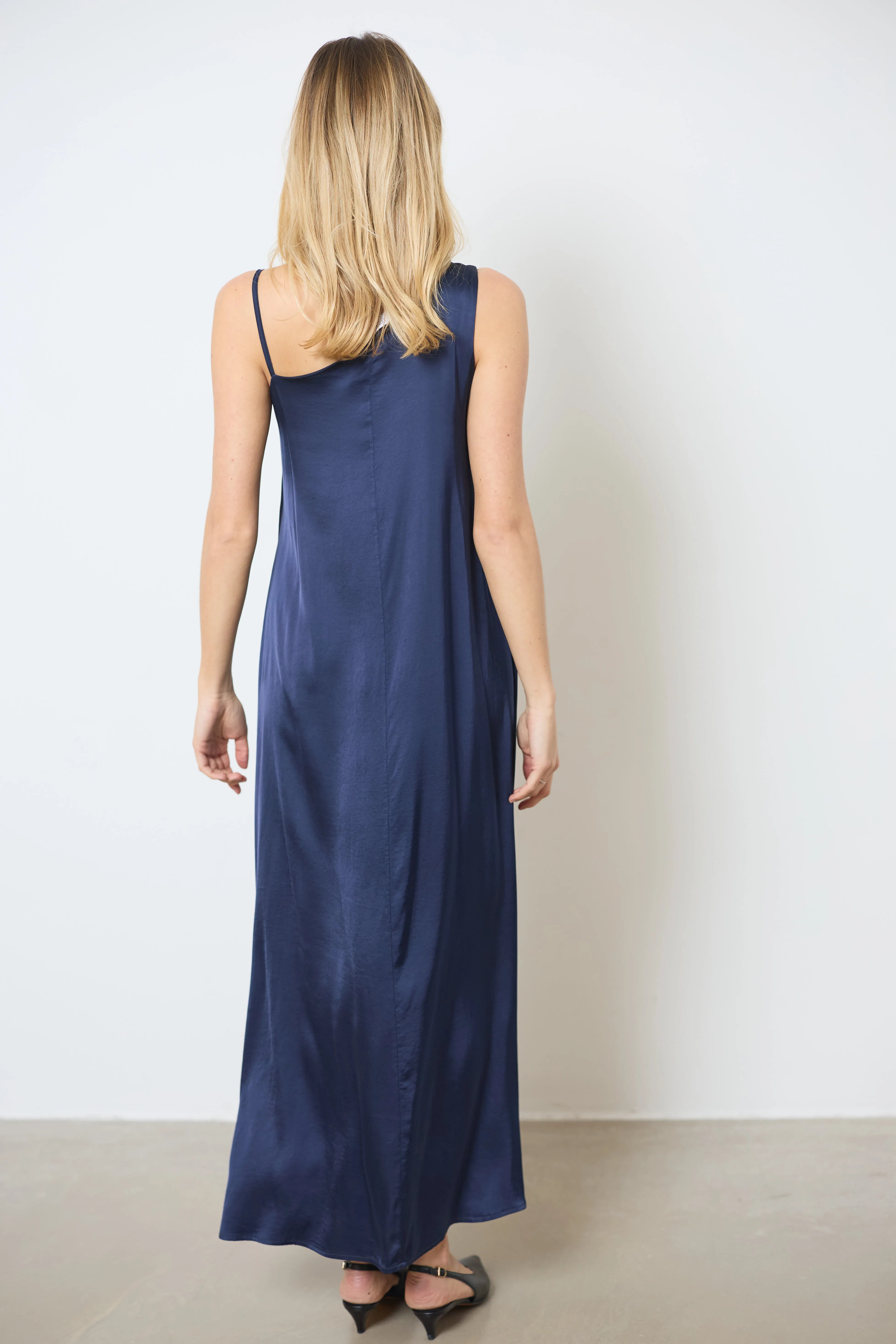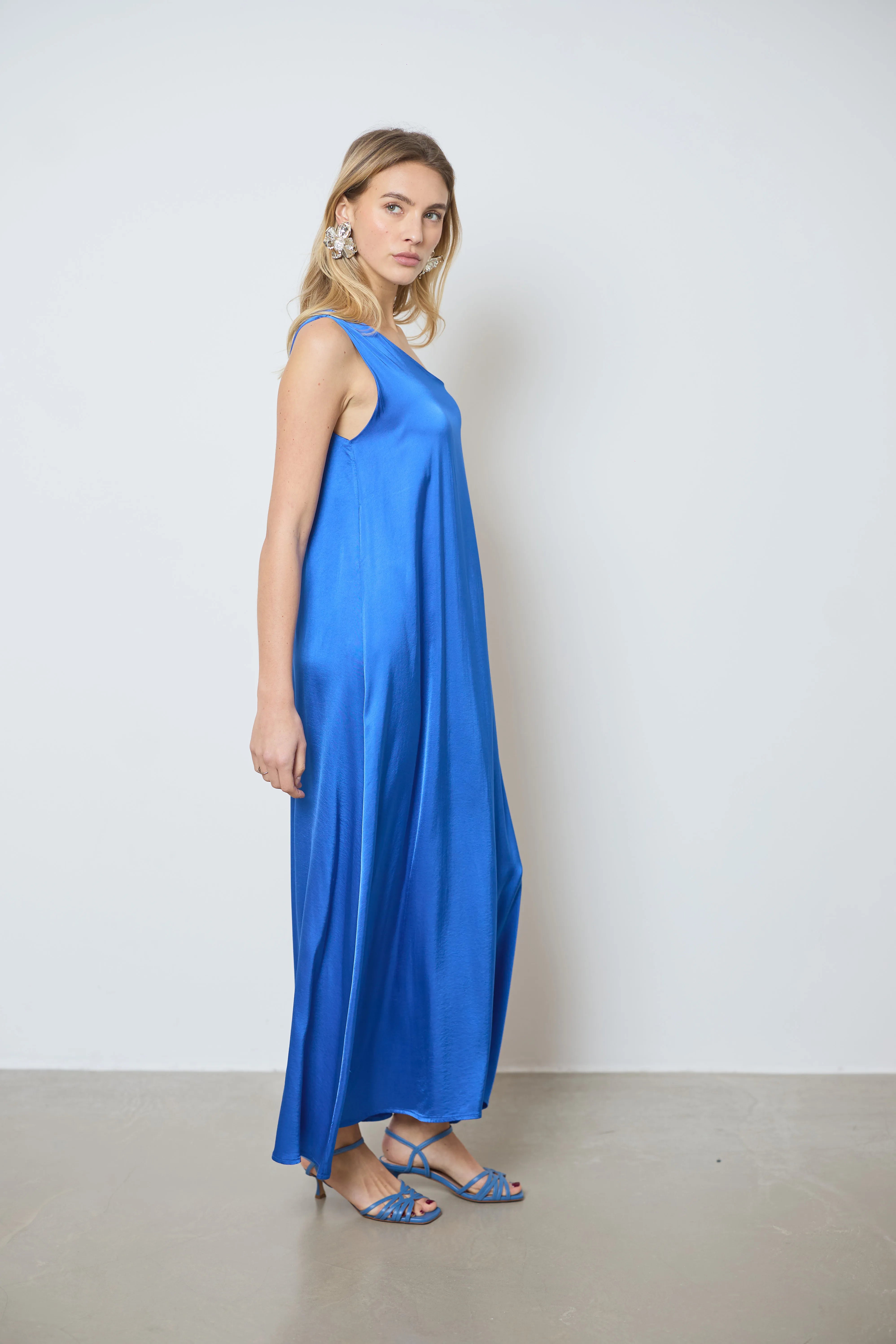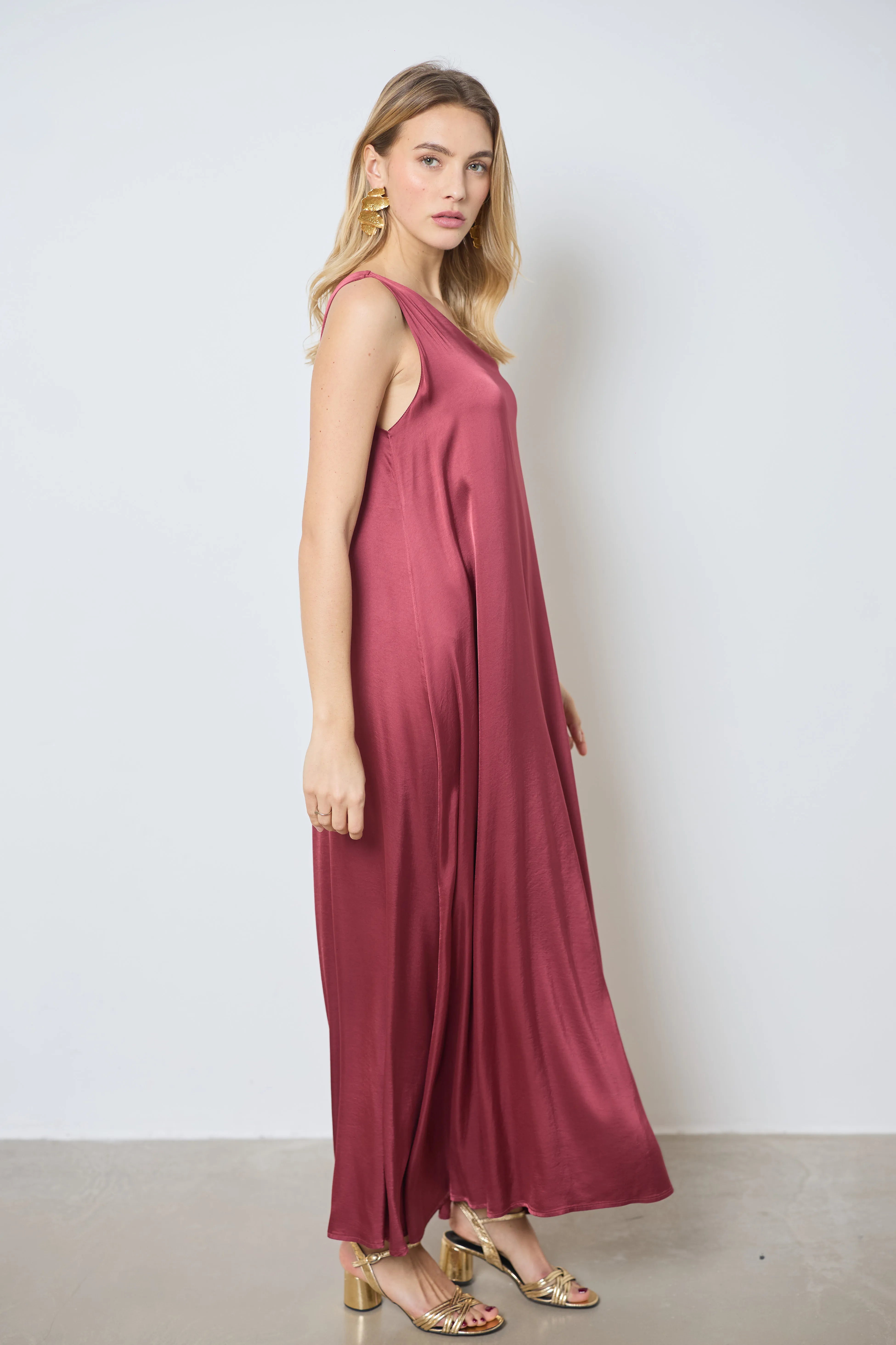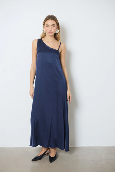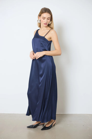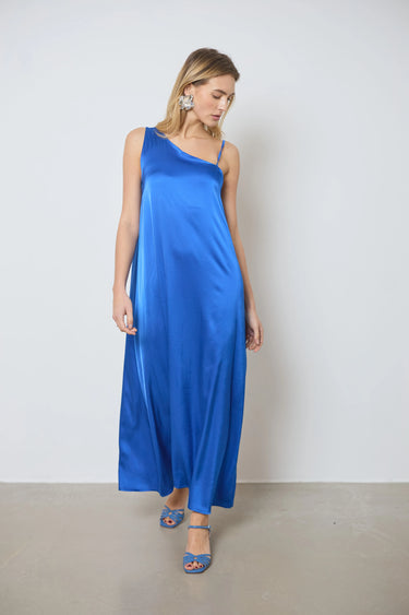 Apportez une touche sophistiquée à votre tenue avec cette longue robe en satin asymétrique. Une bretelle large et l’autre fine crée un effet chic, parfait pour vos soirées élégantes.