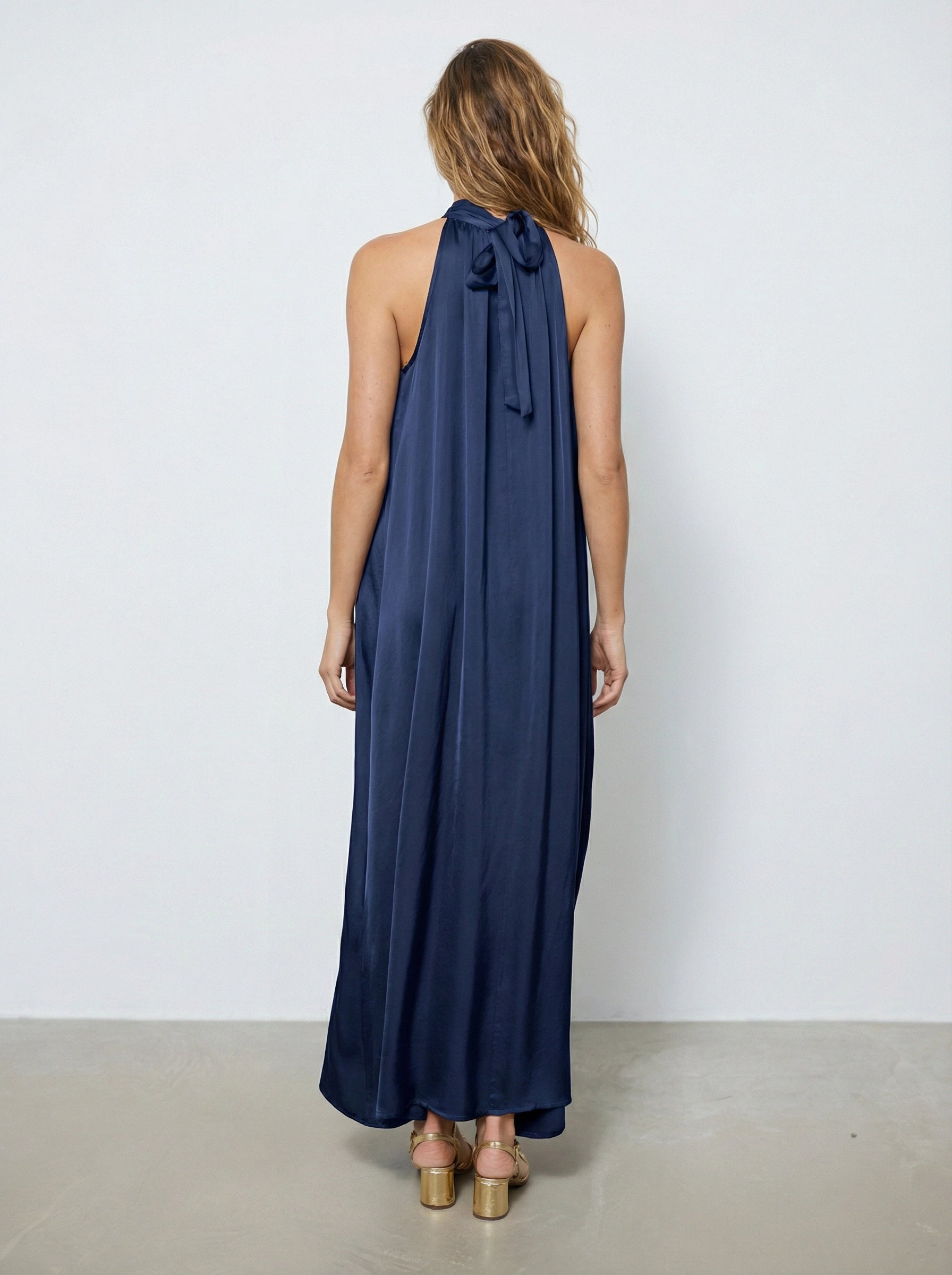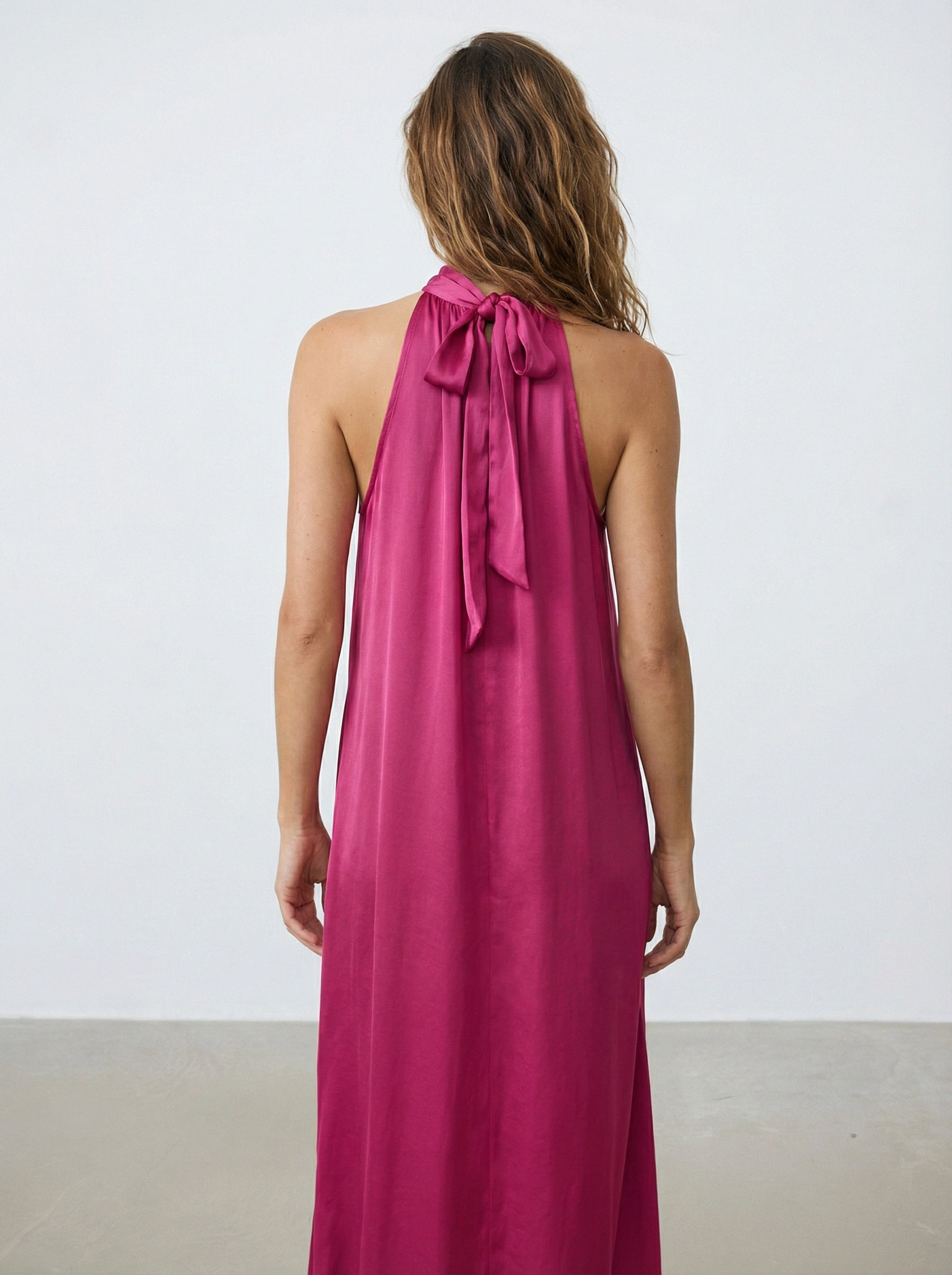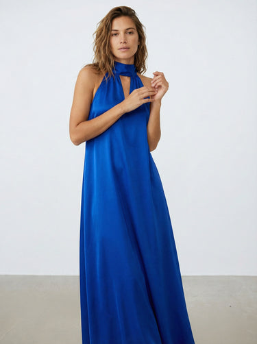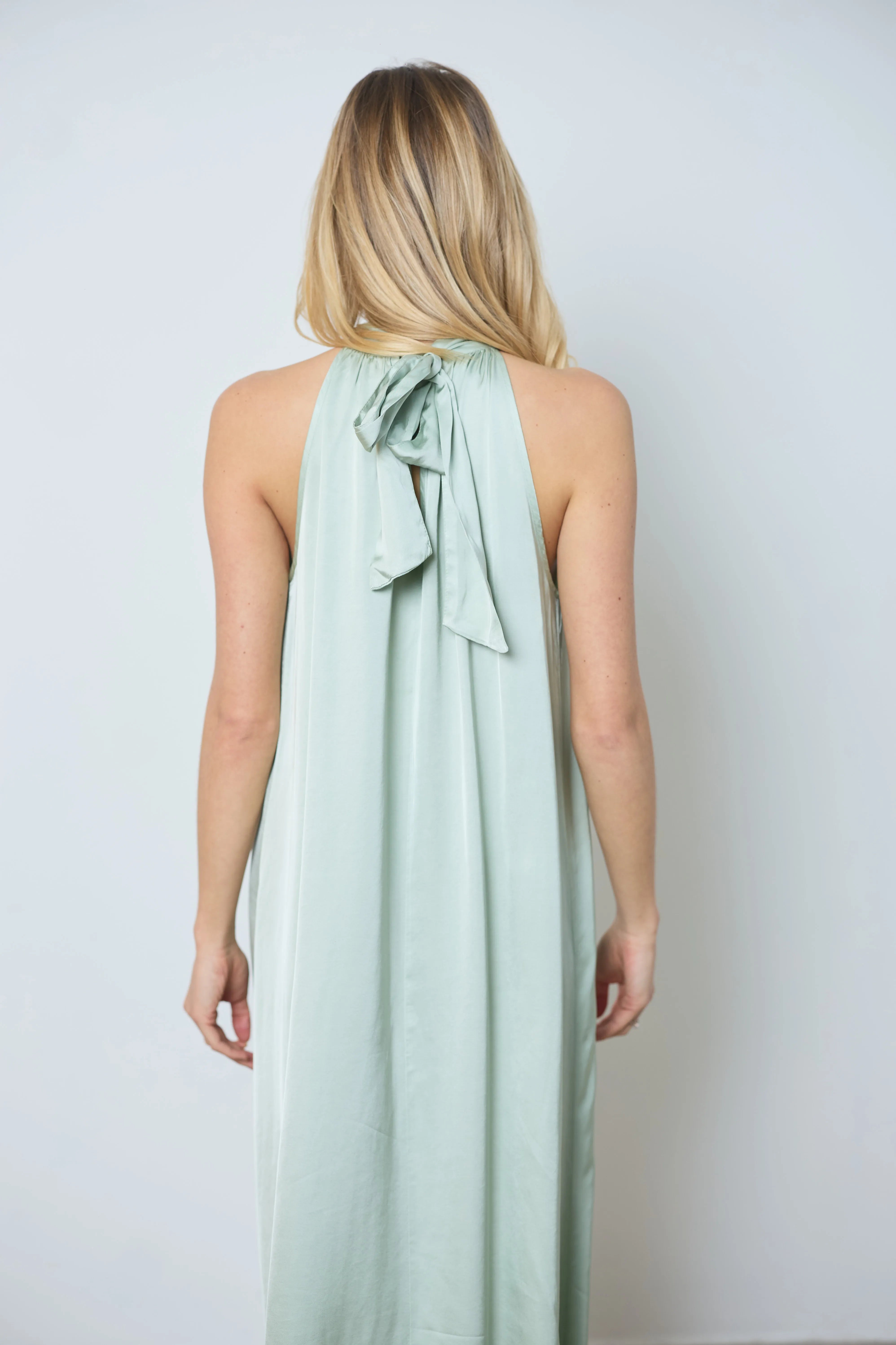 Apportez élégance et légèreté avec la robe Victoria, dérivée de notre meilleure vente. Longue en satin, sans manches, nouée dans le dos et avec une ouverture en V devant pour un style raffiné.