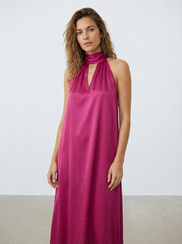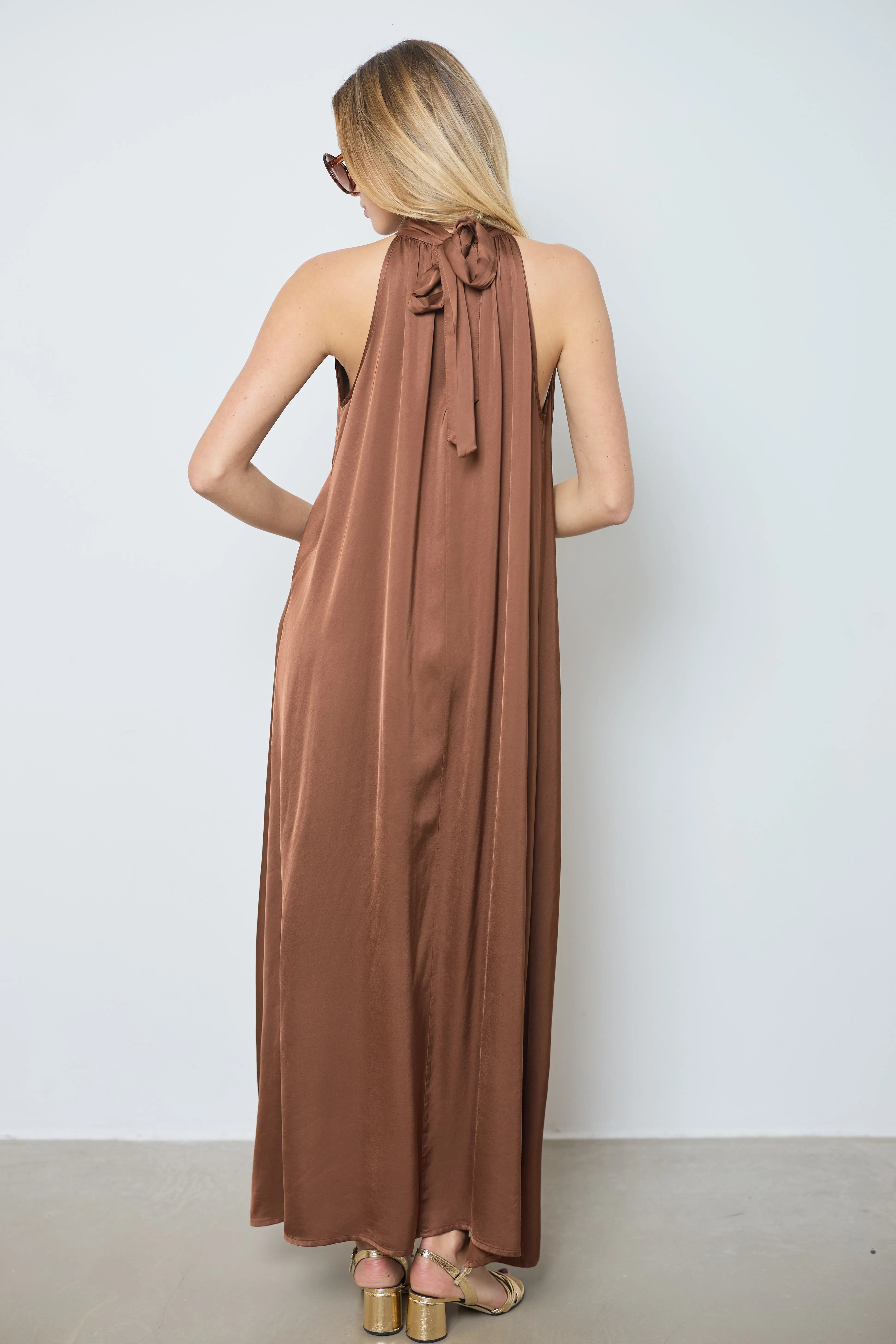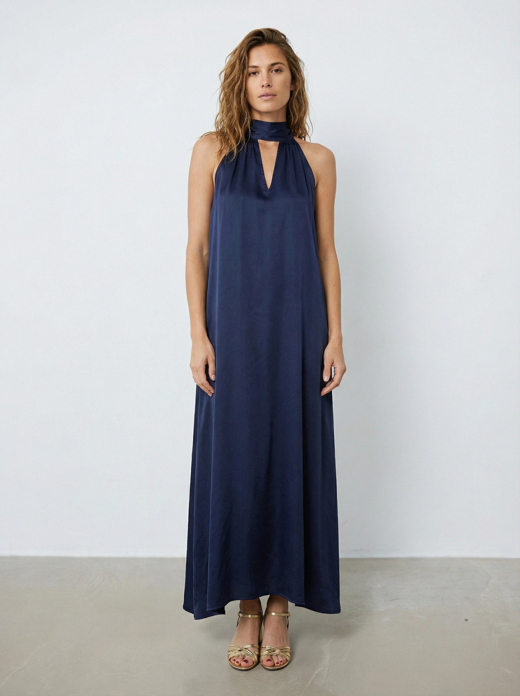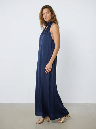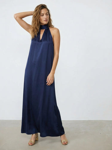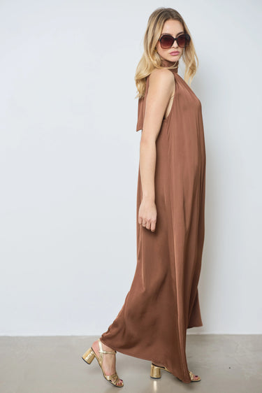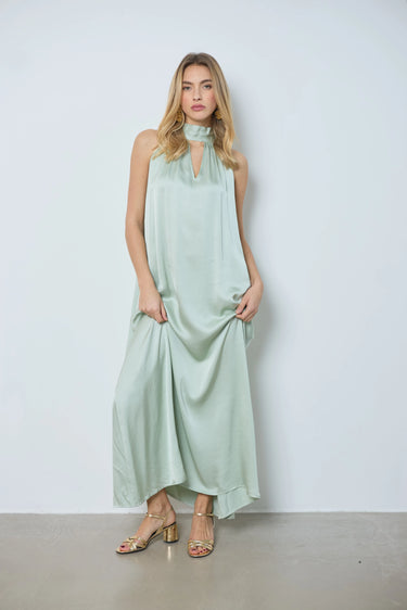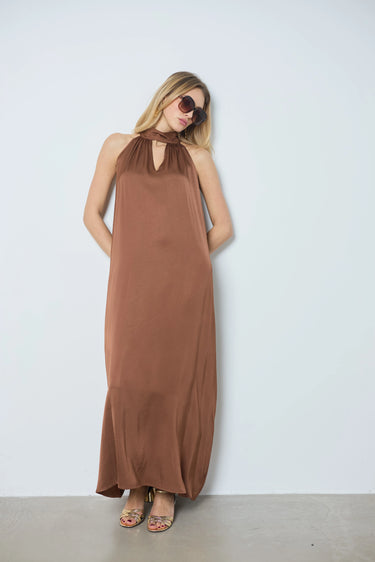 Apportez élégance et légèreté avec la robe Victoria, dérivée de notre meilleure vente. Longue en satin, sans manches, nouée dans le dos et avec une ouverture en V devant pour un style raffiné.