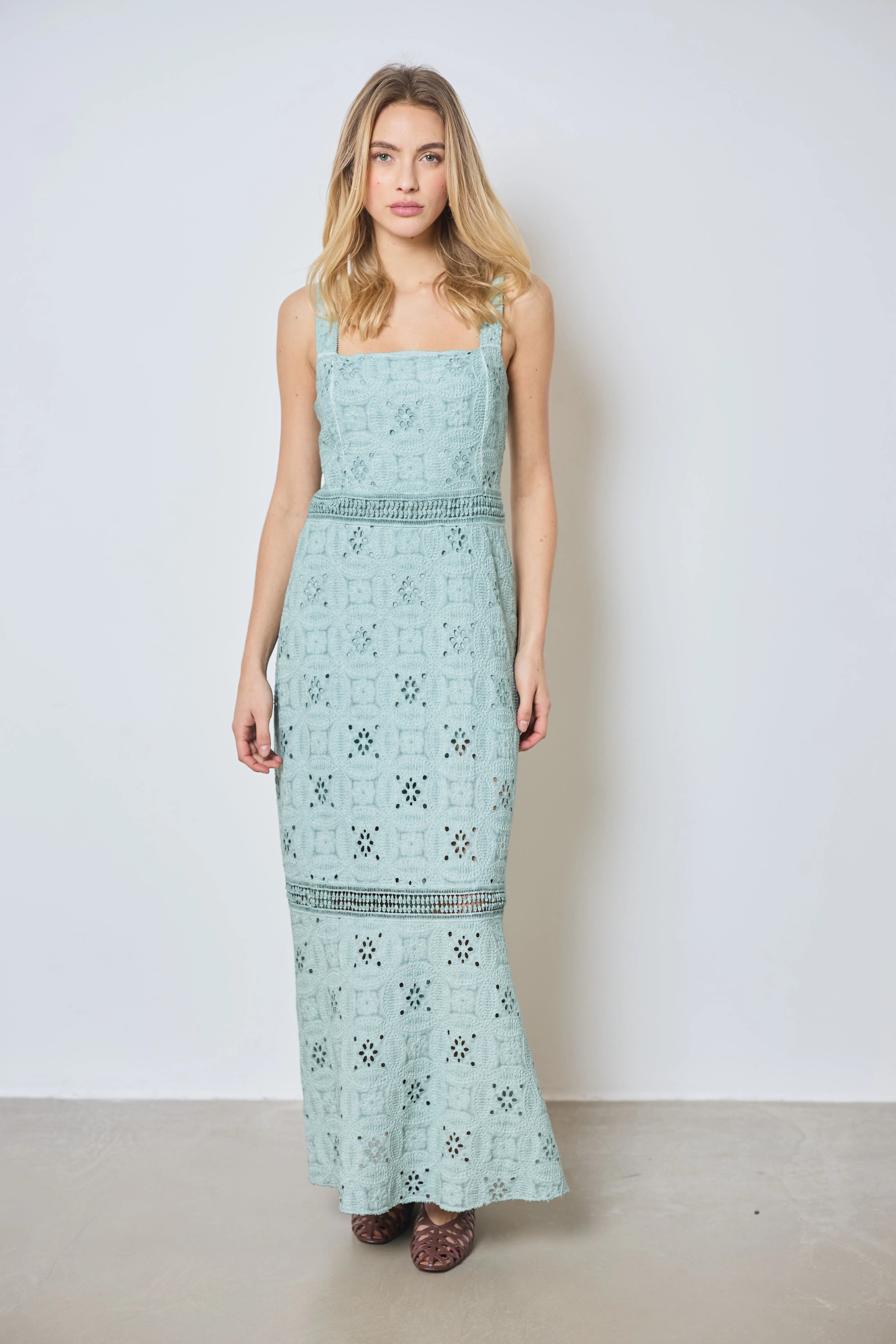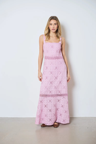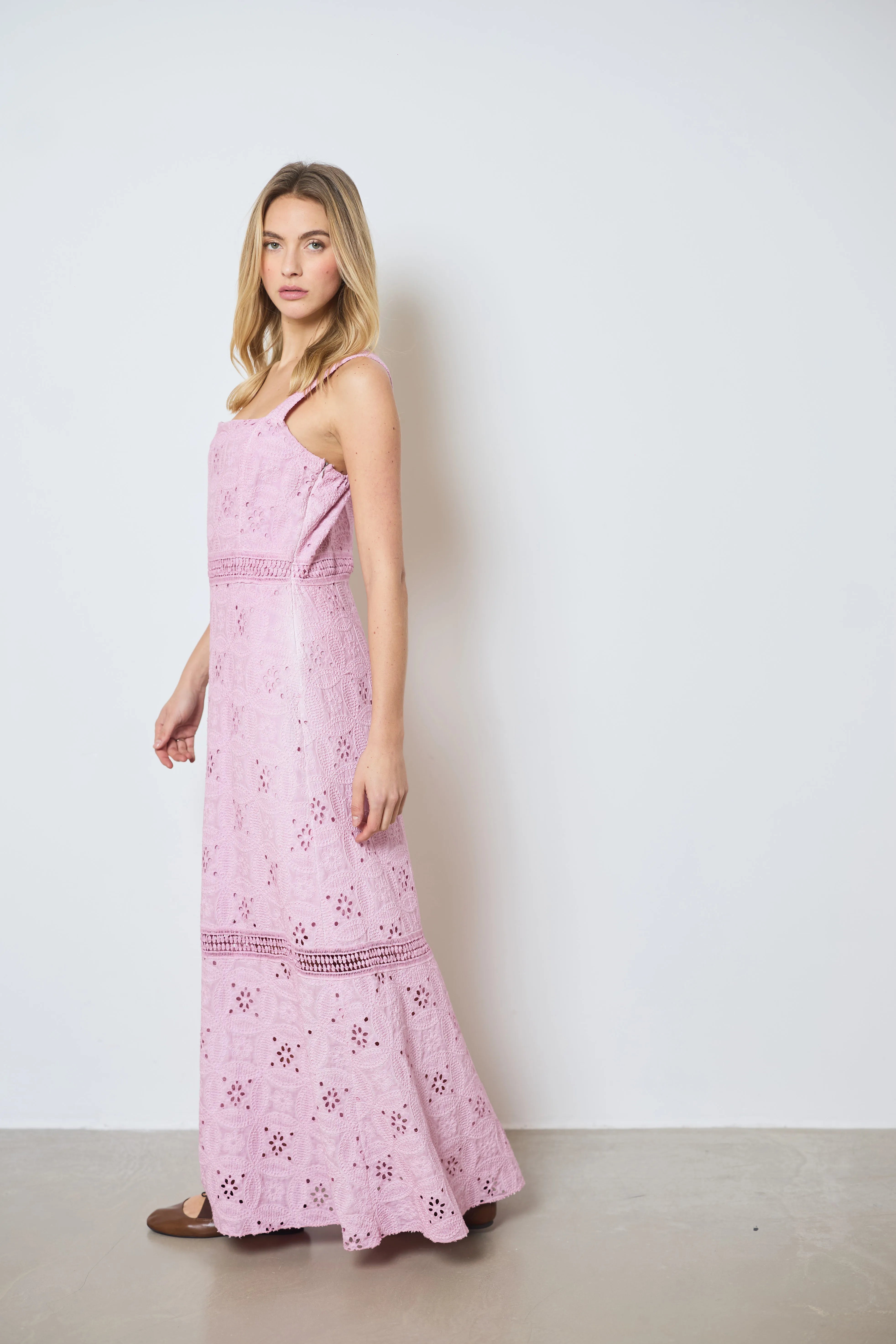 Apportez une touche romantique à votre look avec cette longue robe à larges bretelles. Entièrement en broderie anglaise, elle allie légèreté et élégance pour un style estival raffiné.