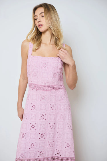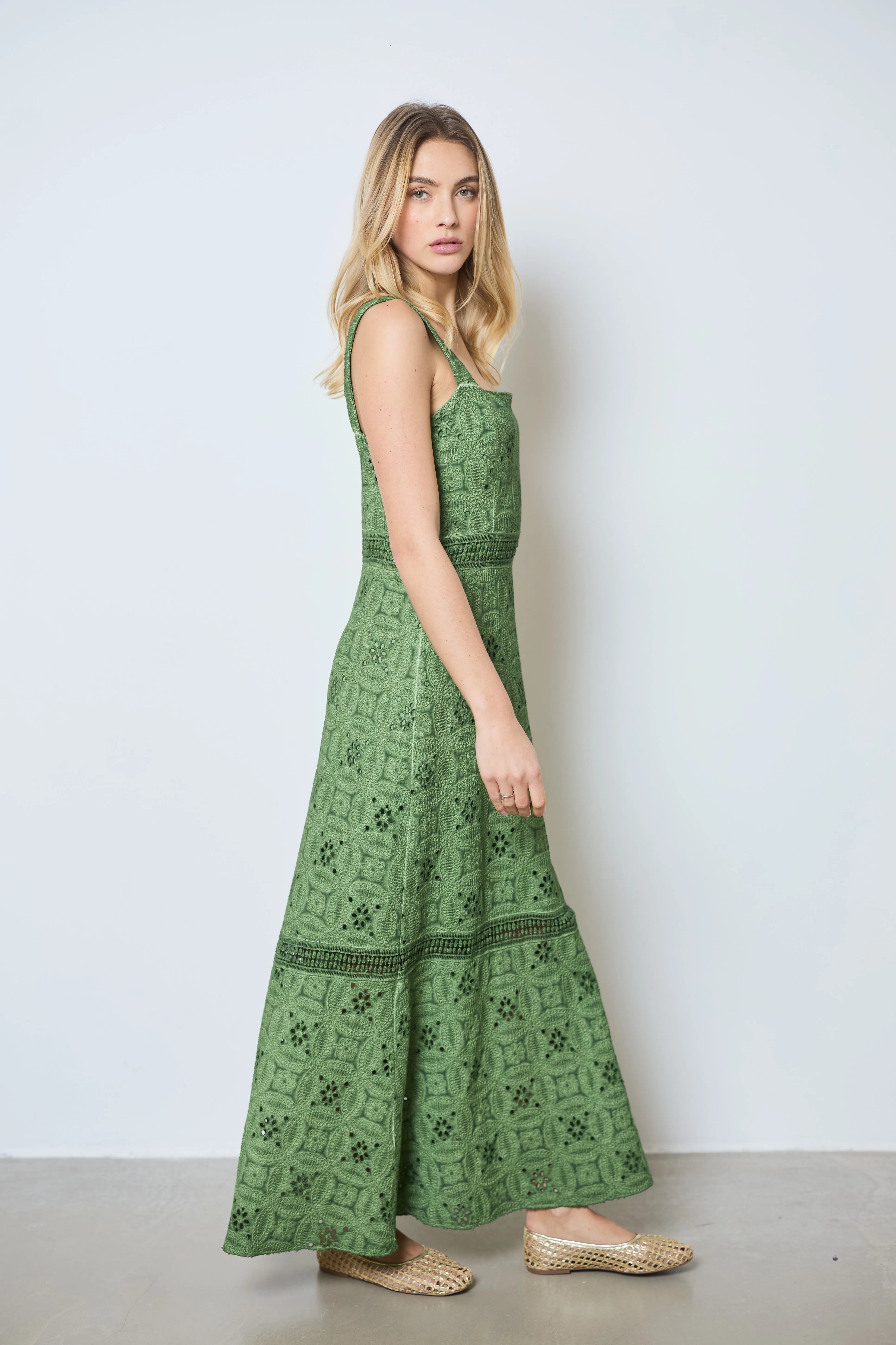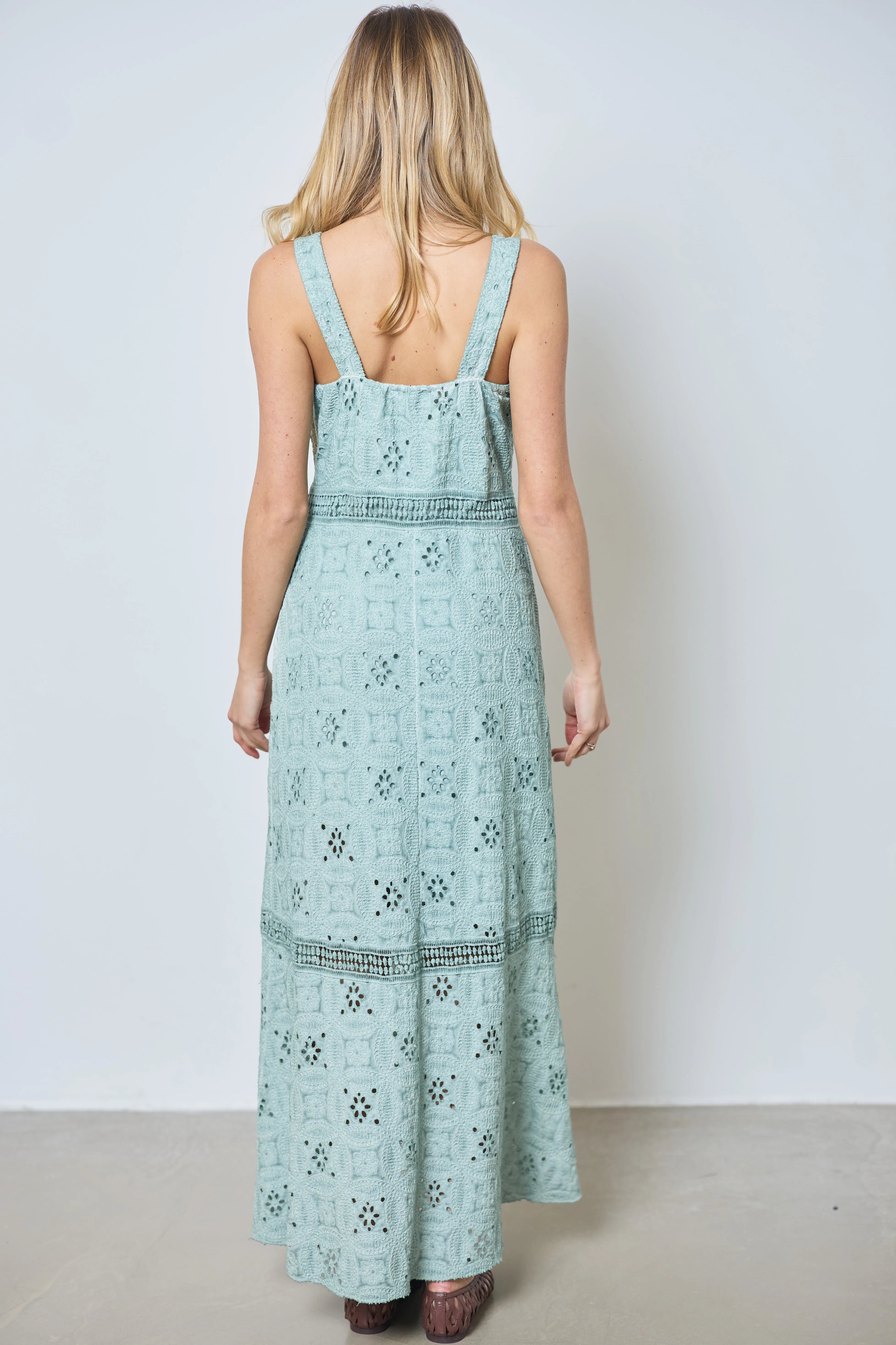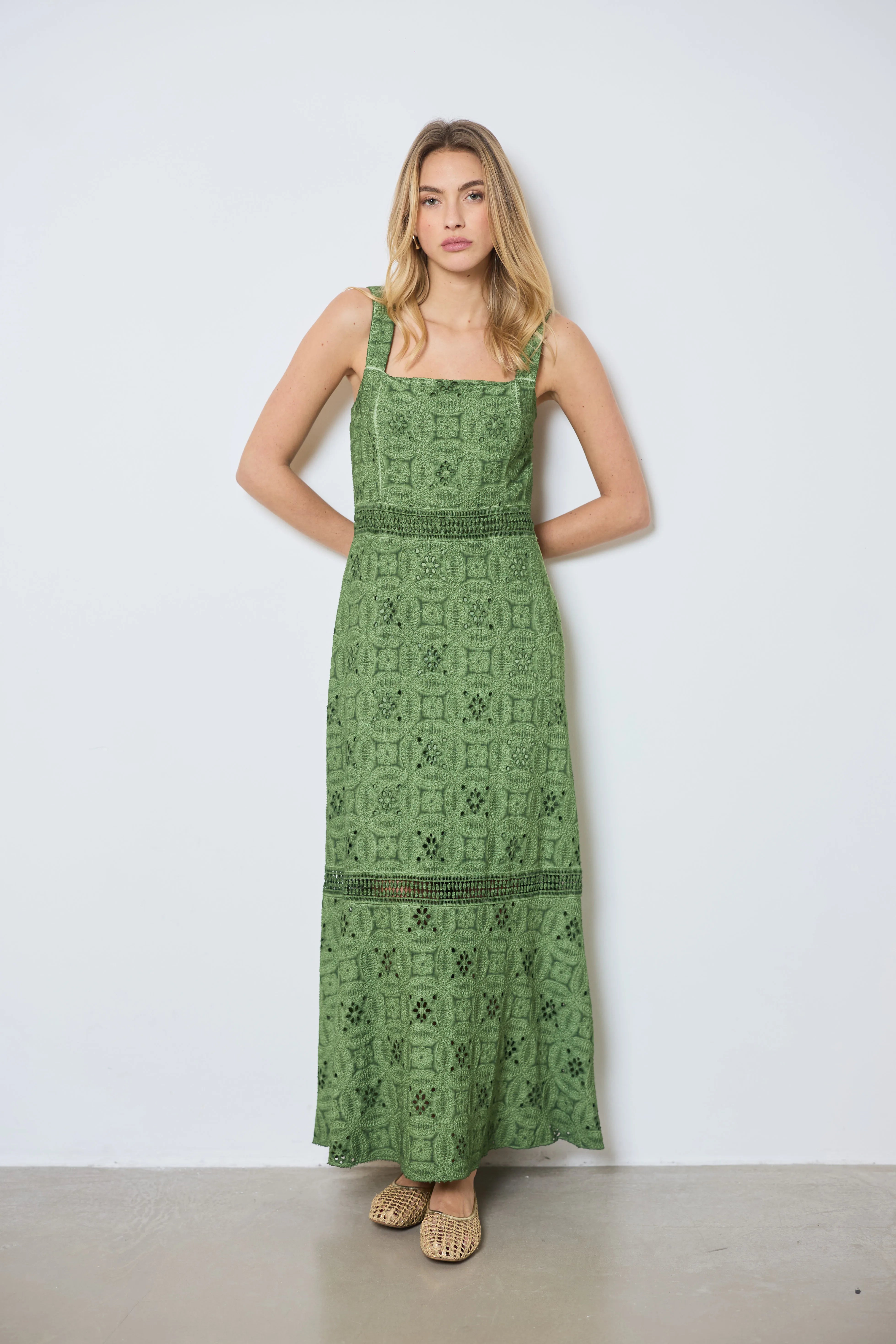 Apportez une touche romantique à votre look avec cette longue robe à larges bretelles. Entièrement en broderie anglaise, elle allie légèreté et élégance pour un style estival raffiné.
