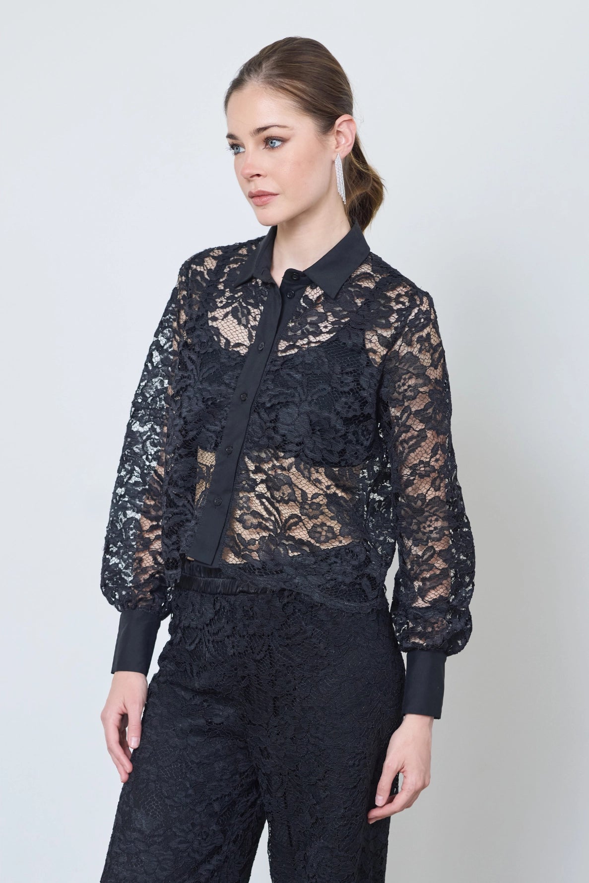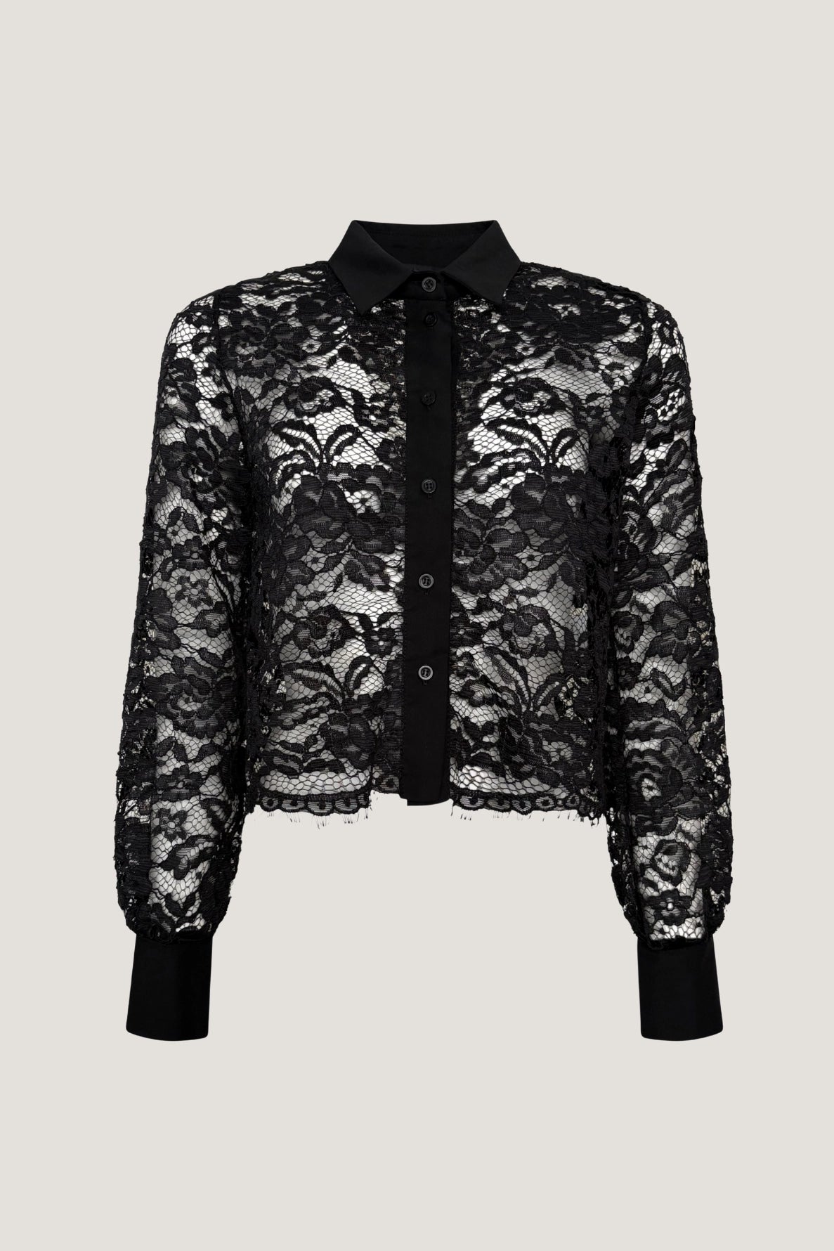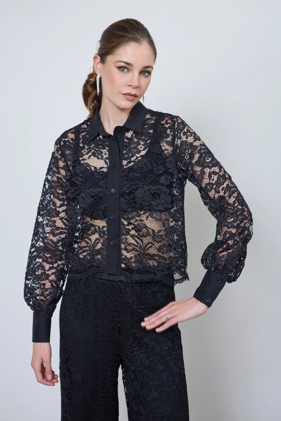 Apportez une touche d'élégance audacieuse à votre garde-robe avec la chemise Flore, confectionnée en dentelle noire délicate. Légère, raffinée et subtilement transparente, elle sublime toutes vos silhouettes et se porte aussi bien de jour que de nuit.