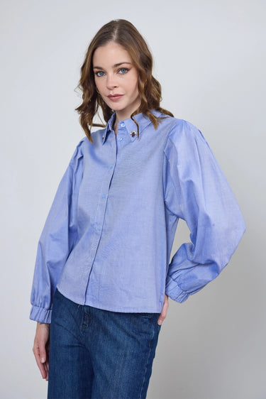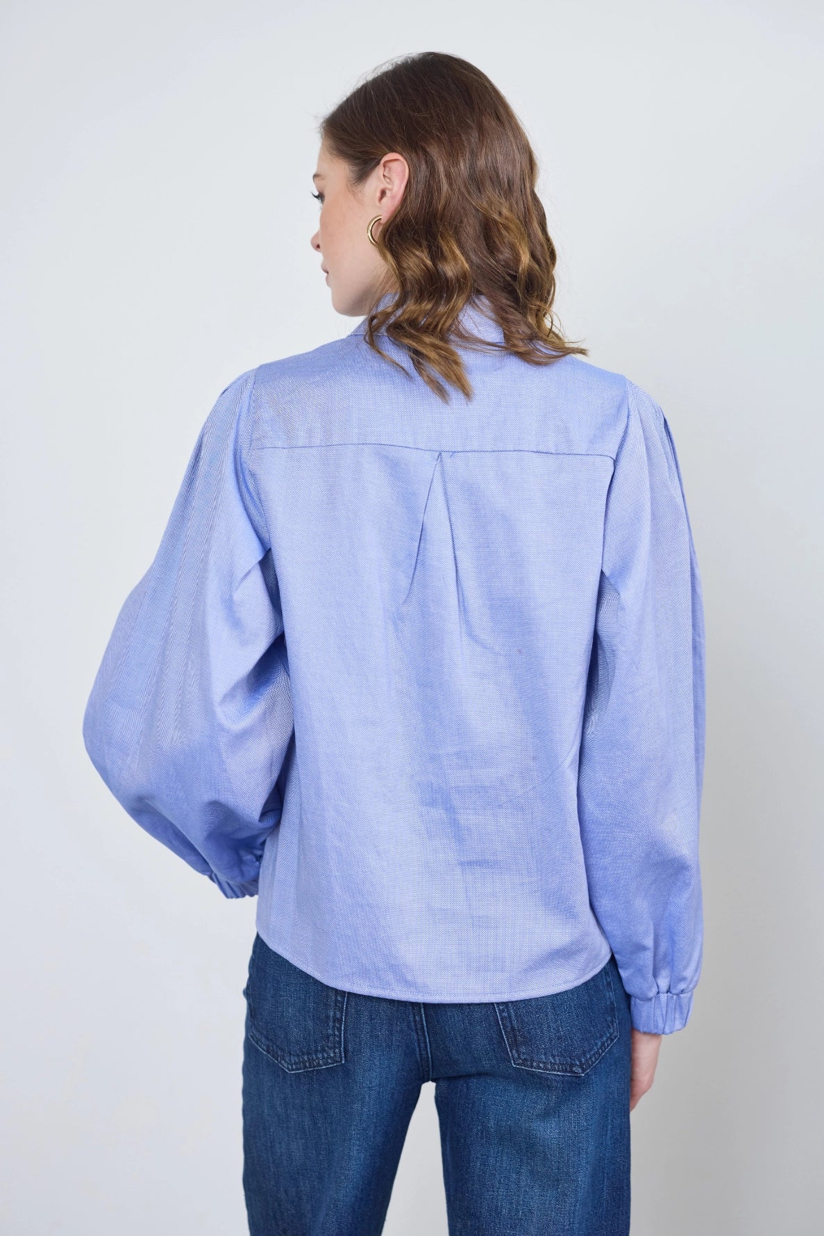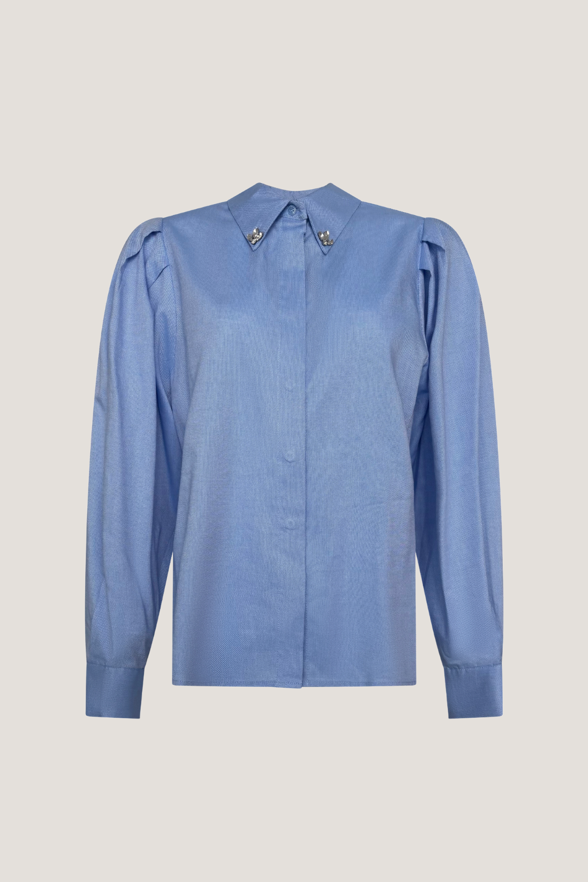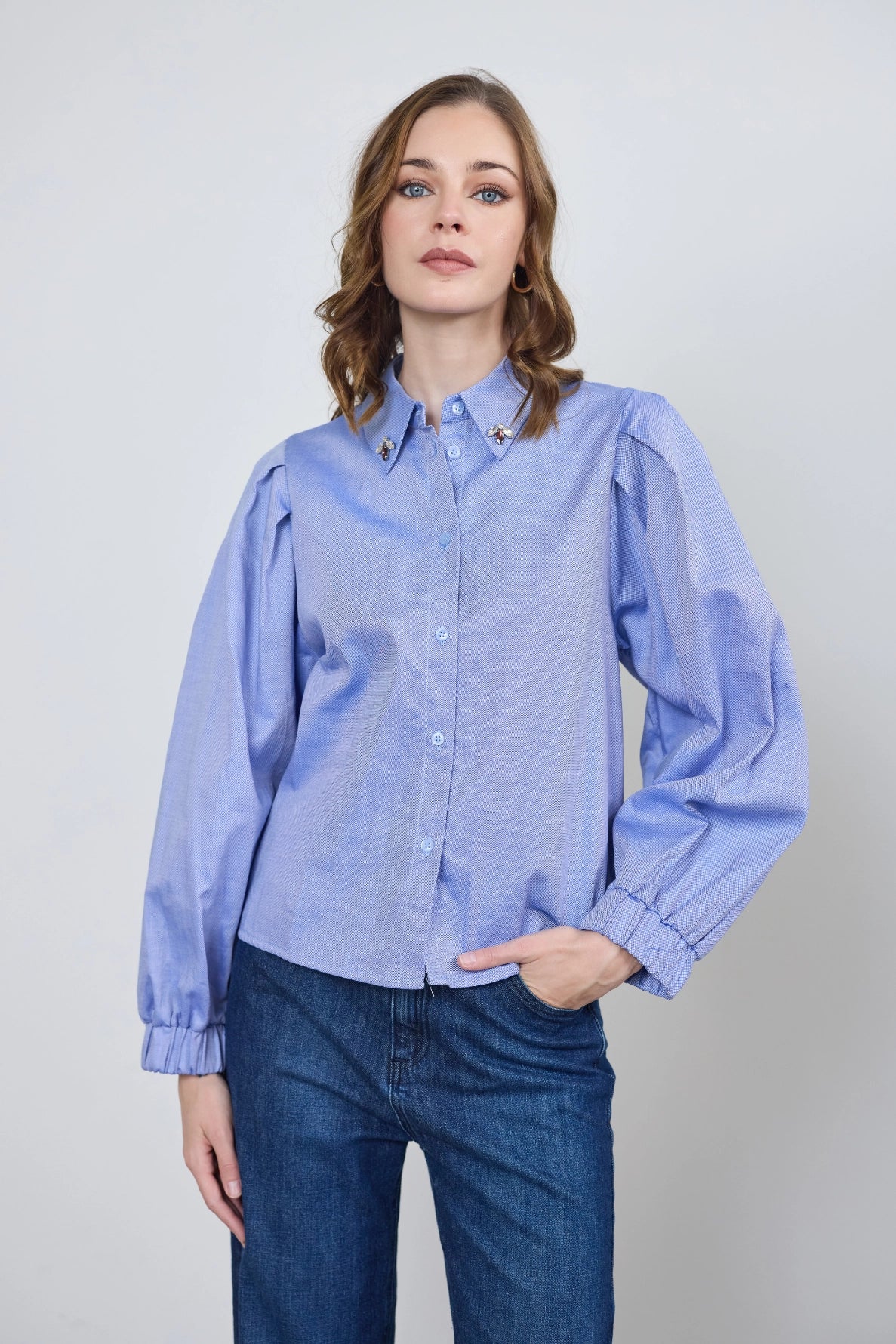 Lumineuse et raffinée, la chemise Henriette allie élégance et originalité avec ses manches bouffantes et ses strass délicats au col. Confectionnée en tissu Oxford 100 % coton, elle apporte une touche féminine et chic à vos tenues.