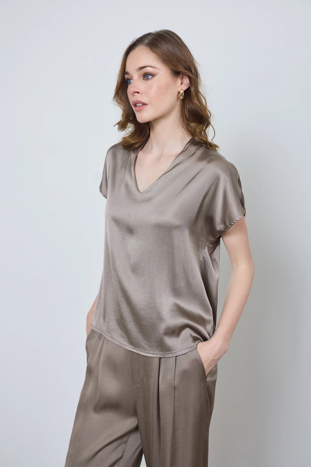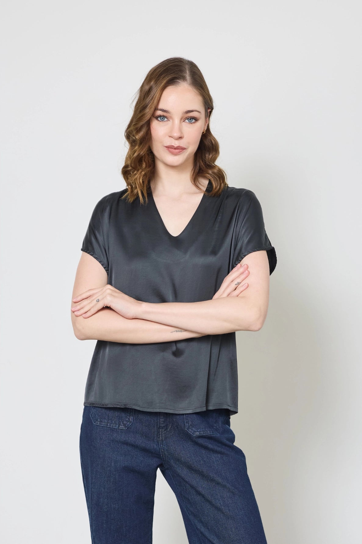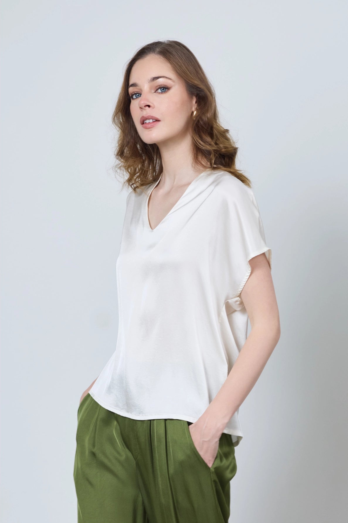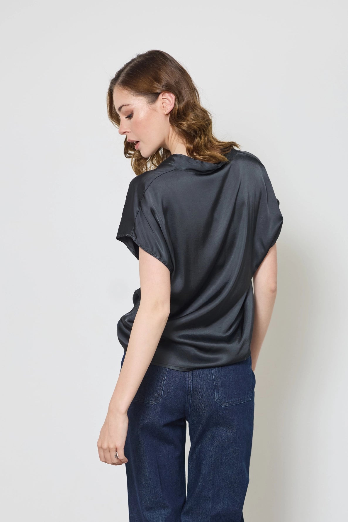 Chic et fluide, le top Gabrielle en satin apporte une touche d’élégance à vos tenues. Son col en V et ses manches courtes chauve-souris dessinent une silhouette délicate et raffinée, parfaite pour les occasions spéciales ou les looks sophistiqués au quotidien.