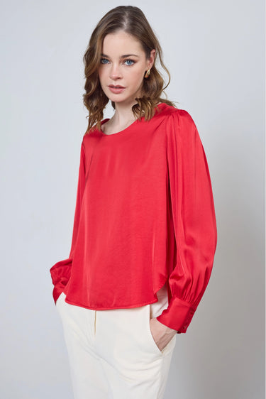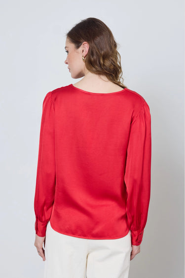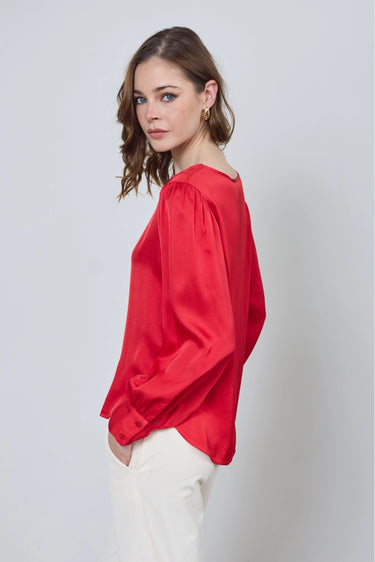 The Stéfanie blouse is made of fluid satin, elegant and lightweight. Its boat neck and blouson sleeves add femininity and sophistication to your outfits.