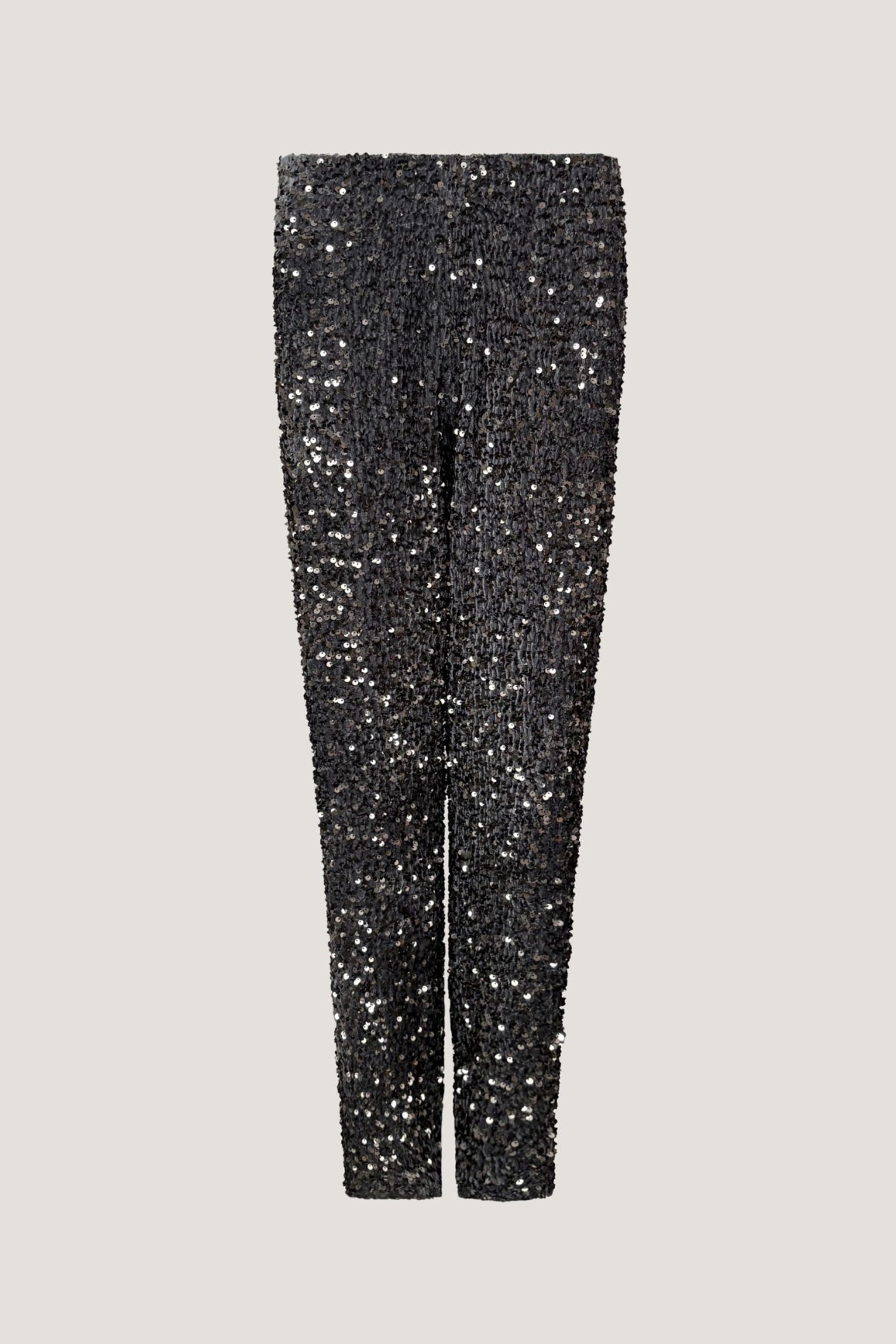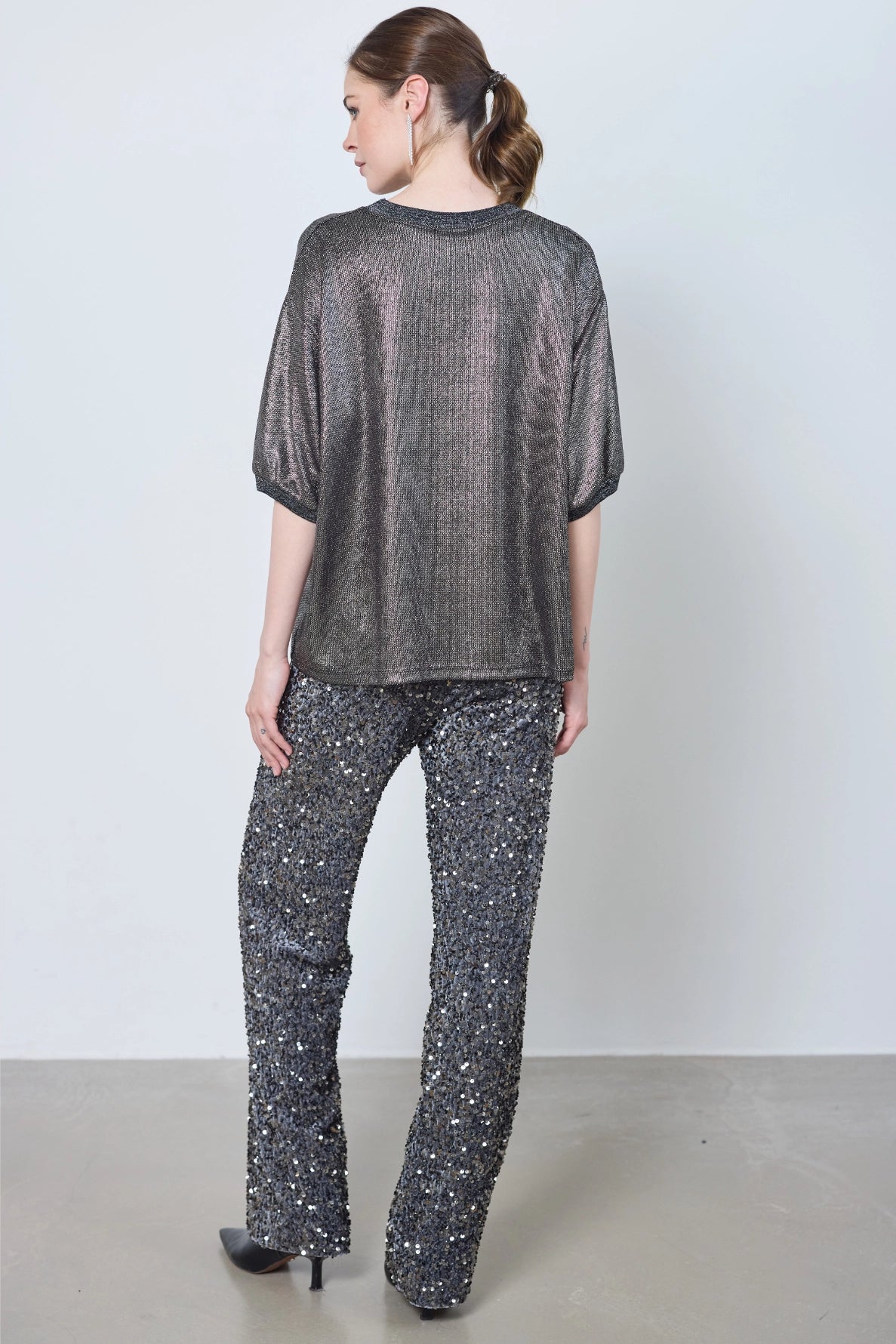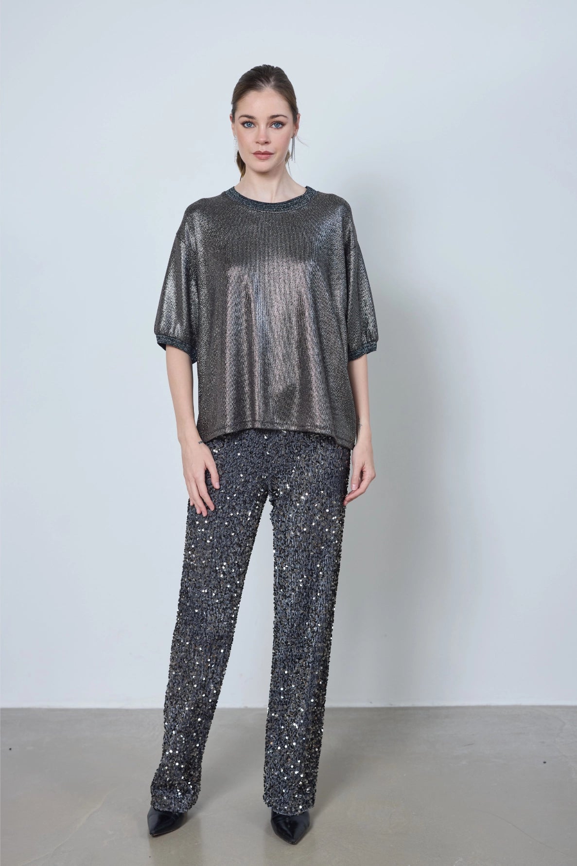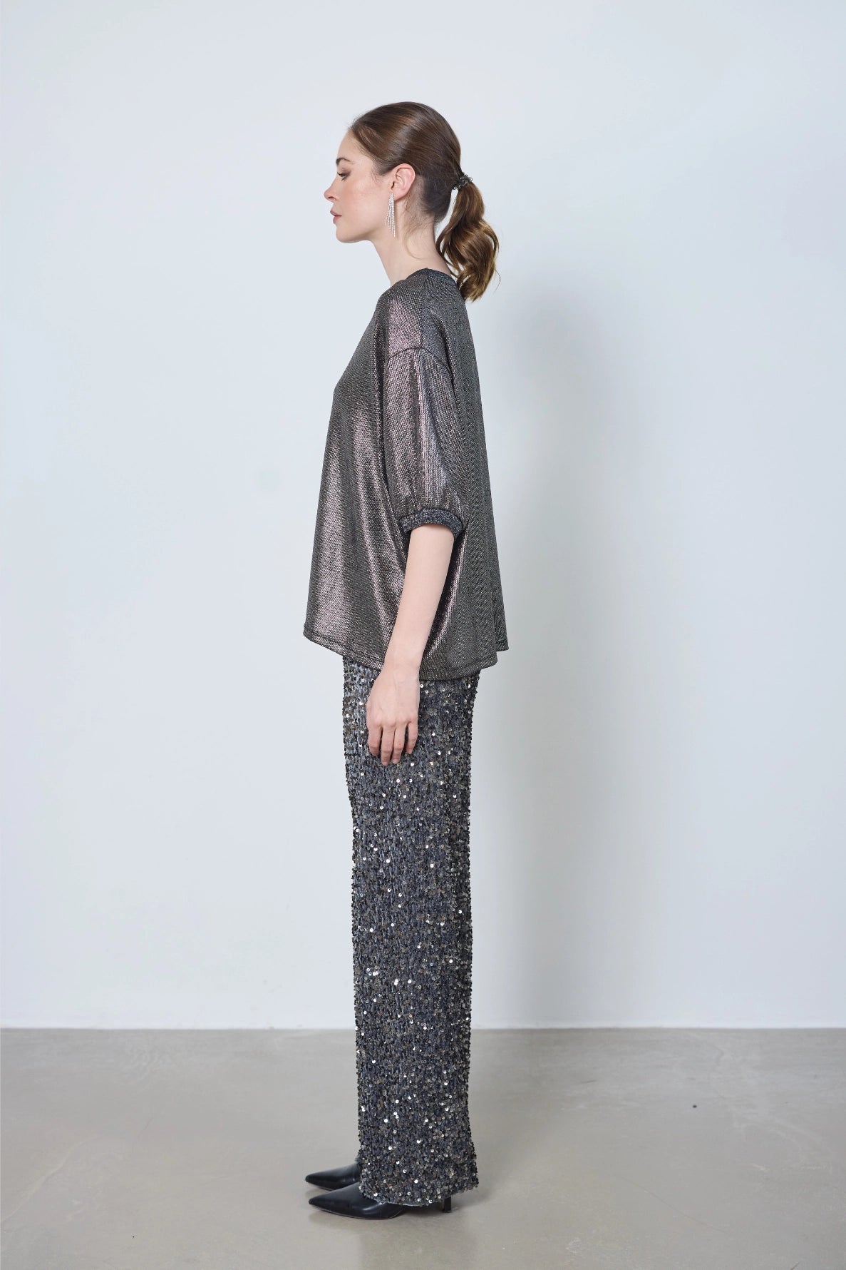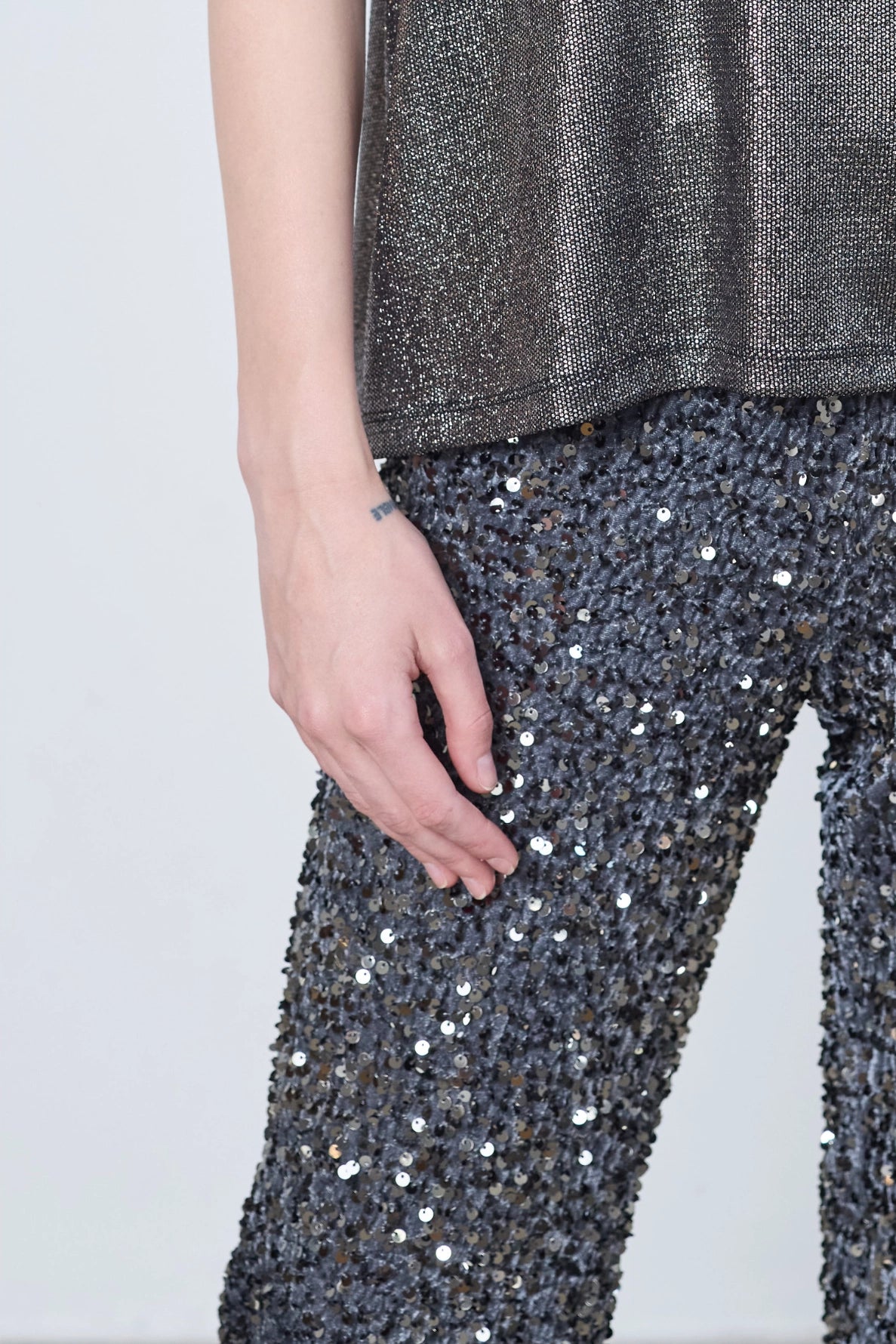 Make your looks shine with the Marylin pants , a strong piece in smooth velvet, entirely enhanced with sequins. Comfortable and spectacular, they enhance your evening outfits as well as your most daring daytime looks.
