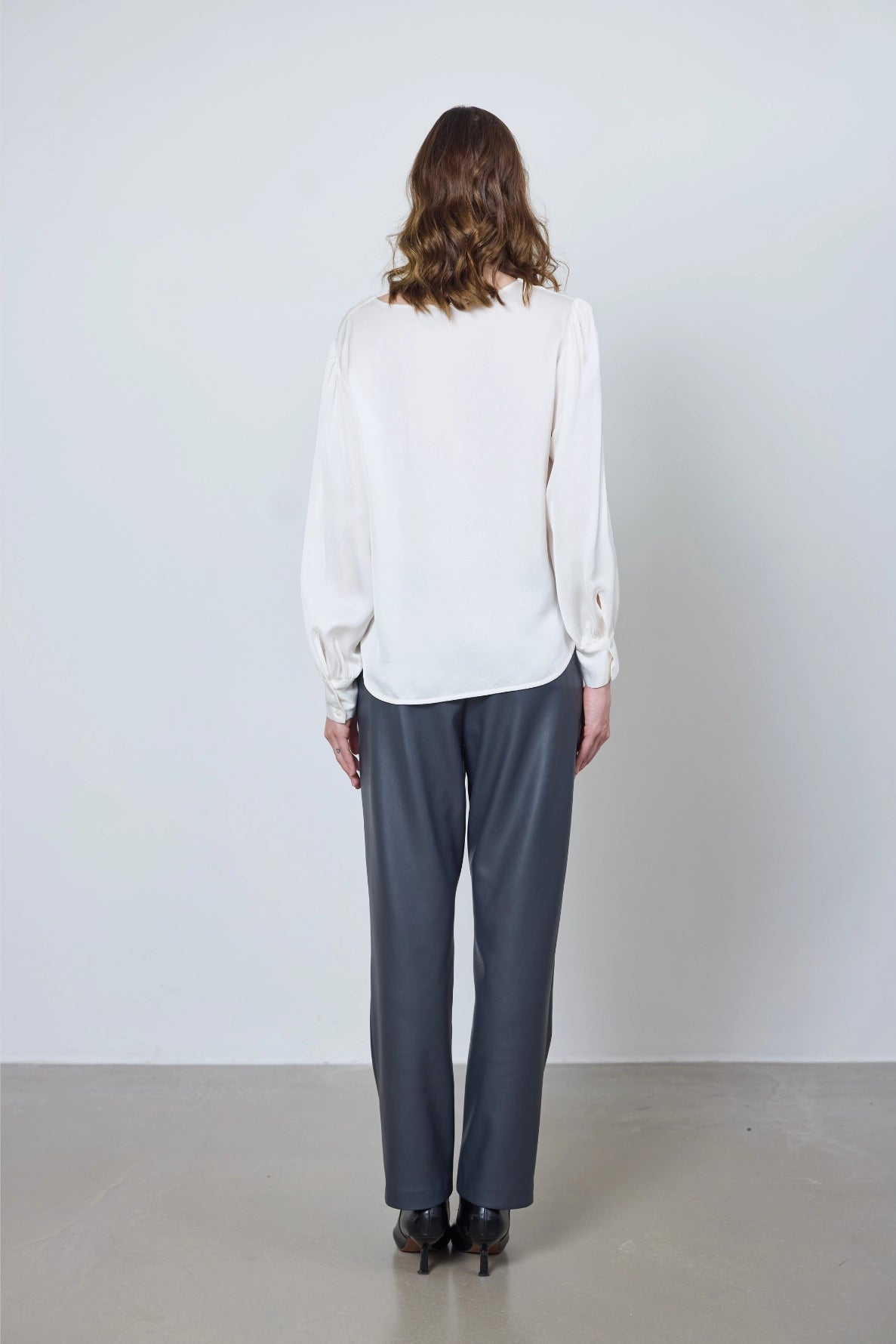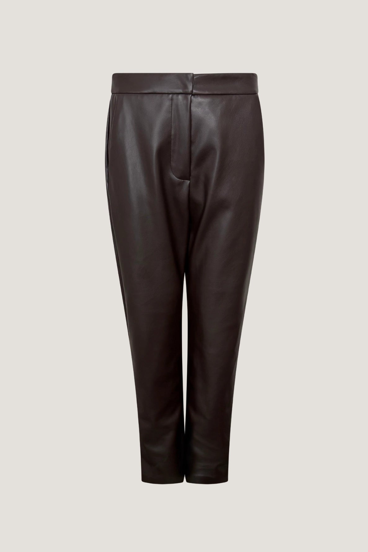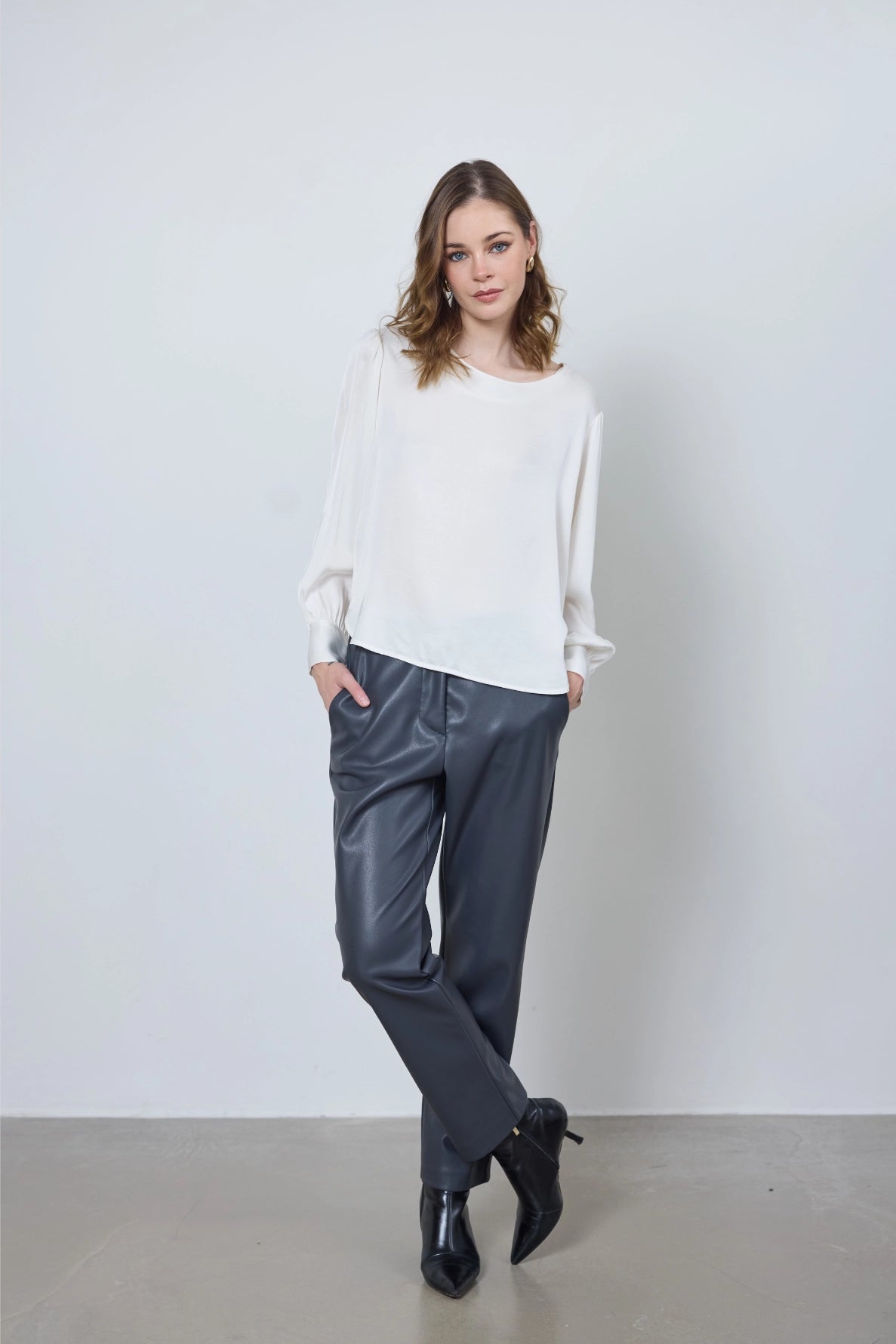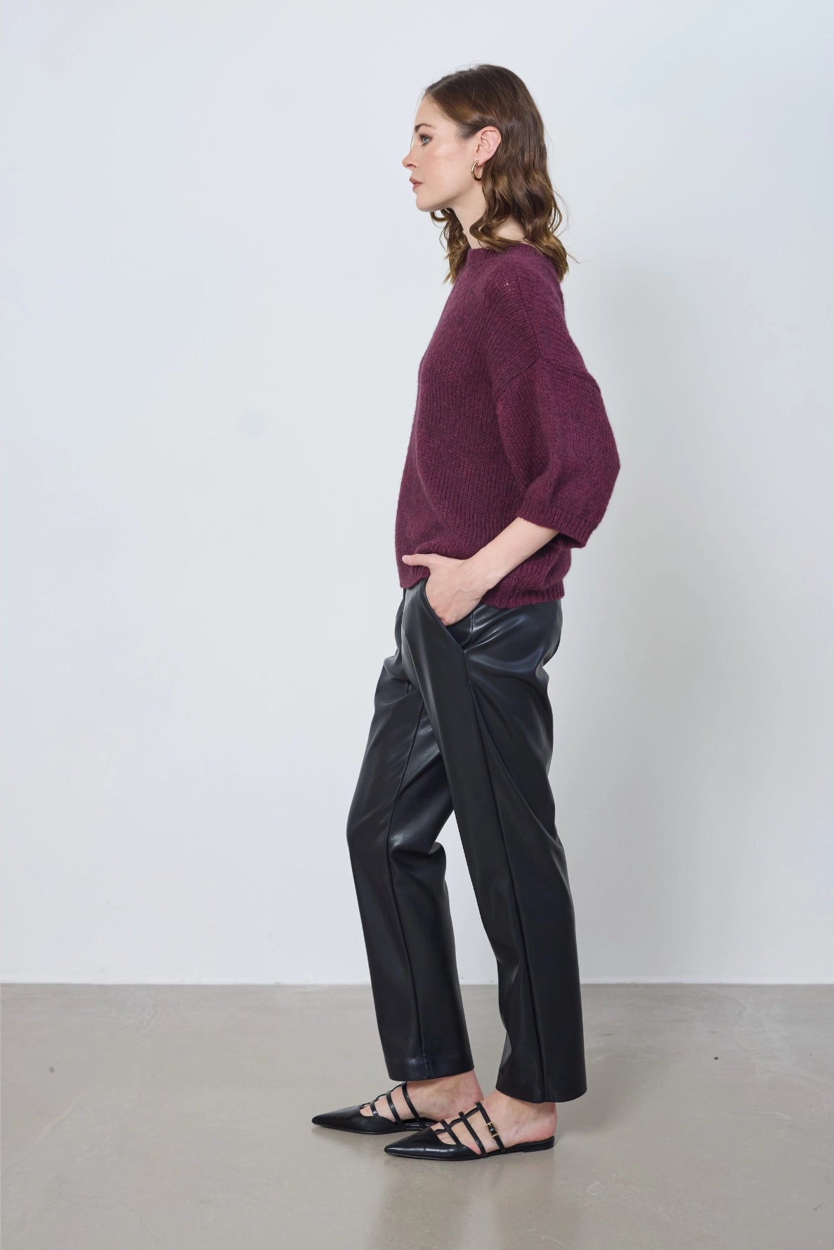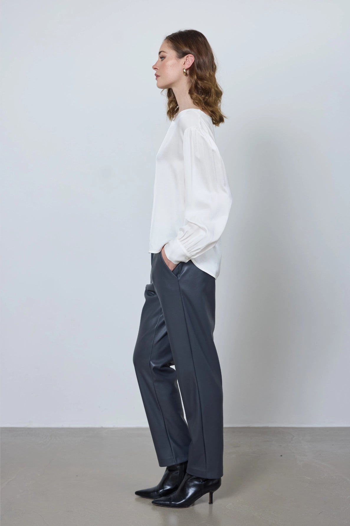 The Laurène pants boast a bold, modern look with their faux leather effect. Their straight cut and flowing fabric add character to any outfit without sacrificing comfort.