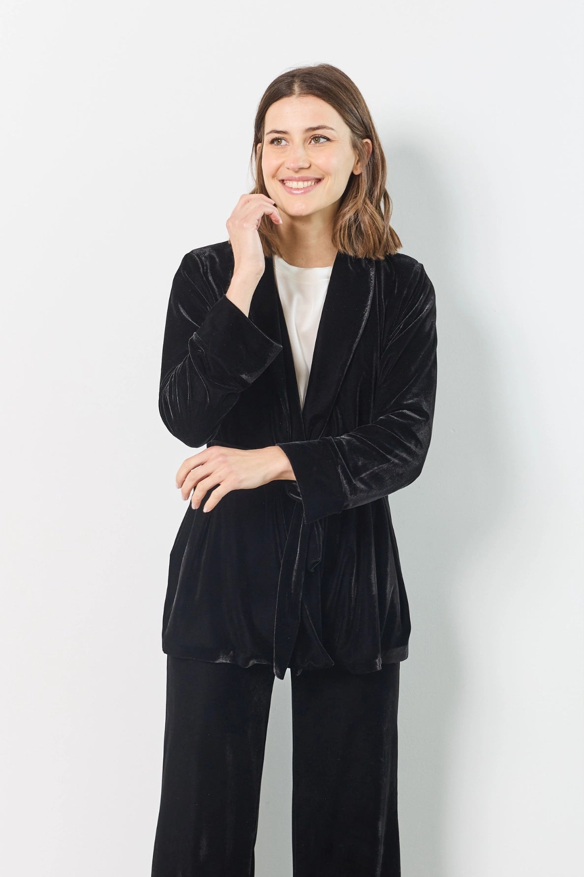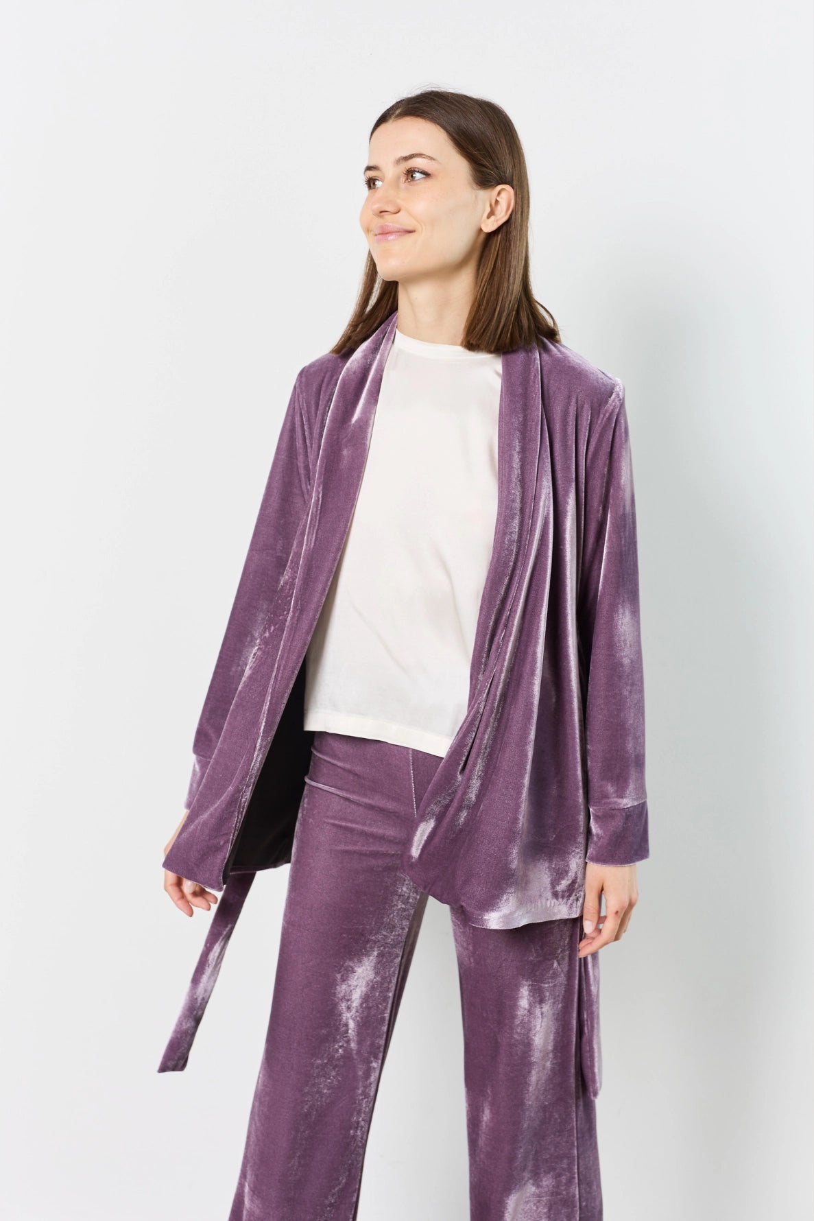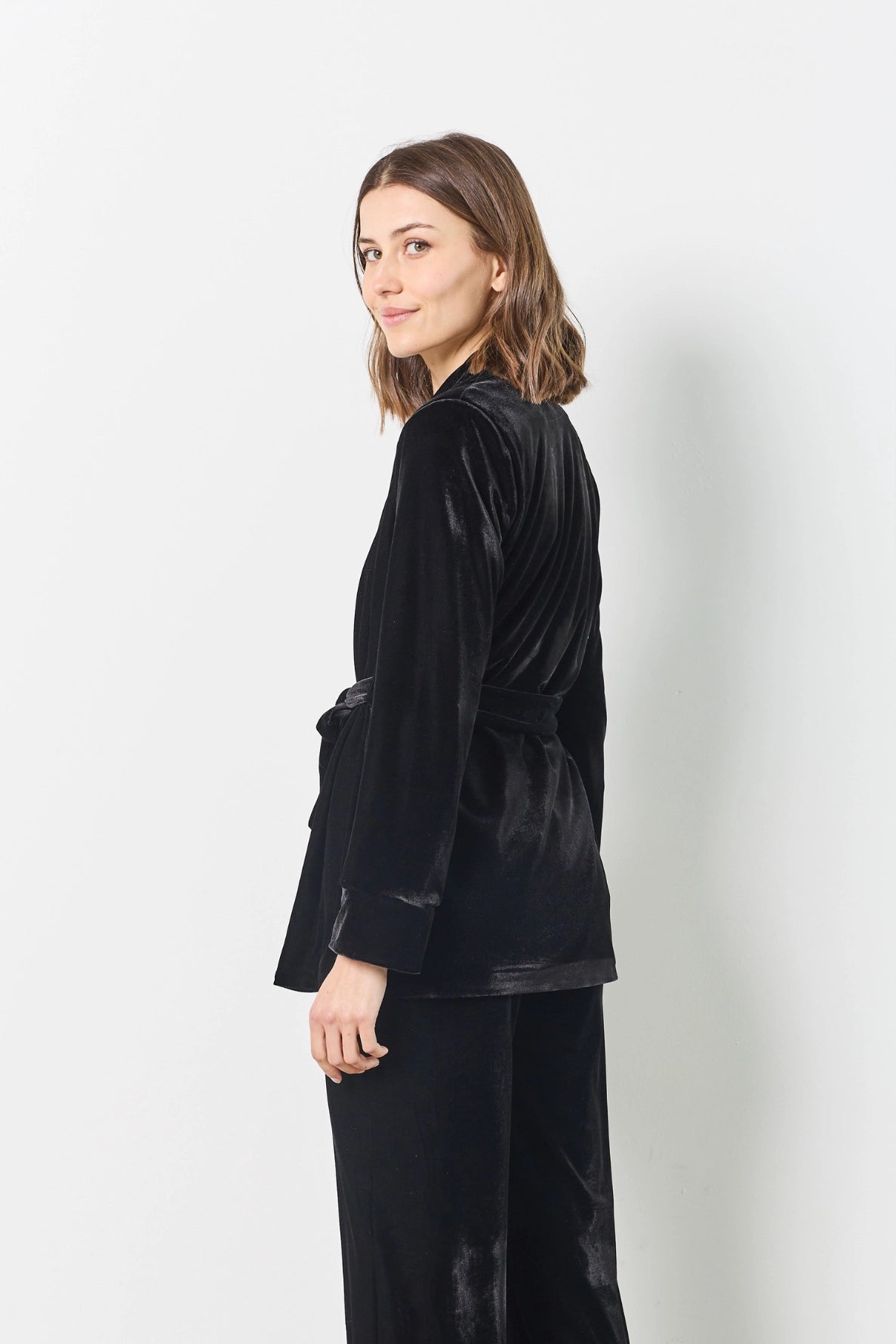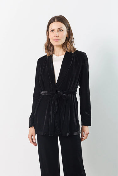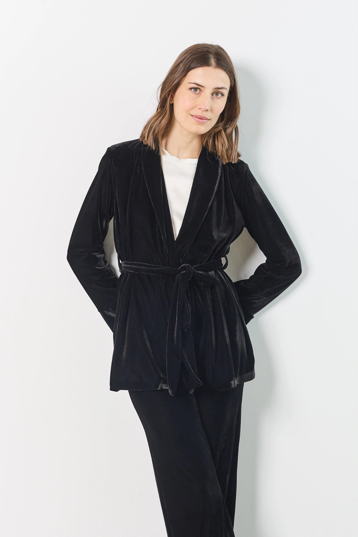 Velvet blazer with belt, combining elegance and comfort. Perfect for stylishly structuring your silhouette.