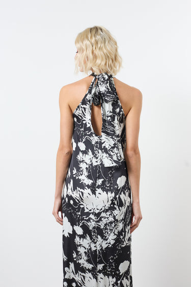 Lange, mouwloze satijnen jurk, soepel en elegant, versterkt door een tijdloze zwart-witte print voor een verfijnde stijl.