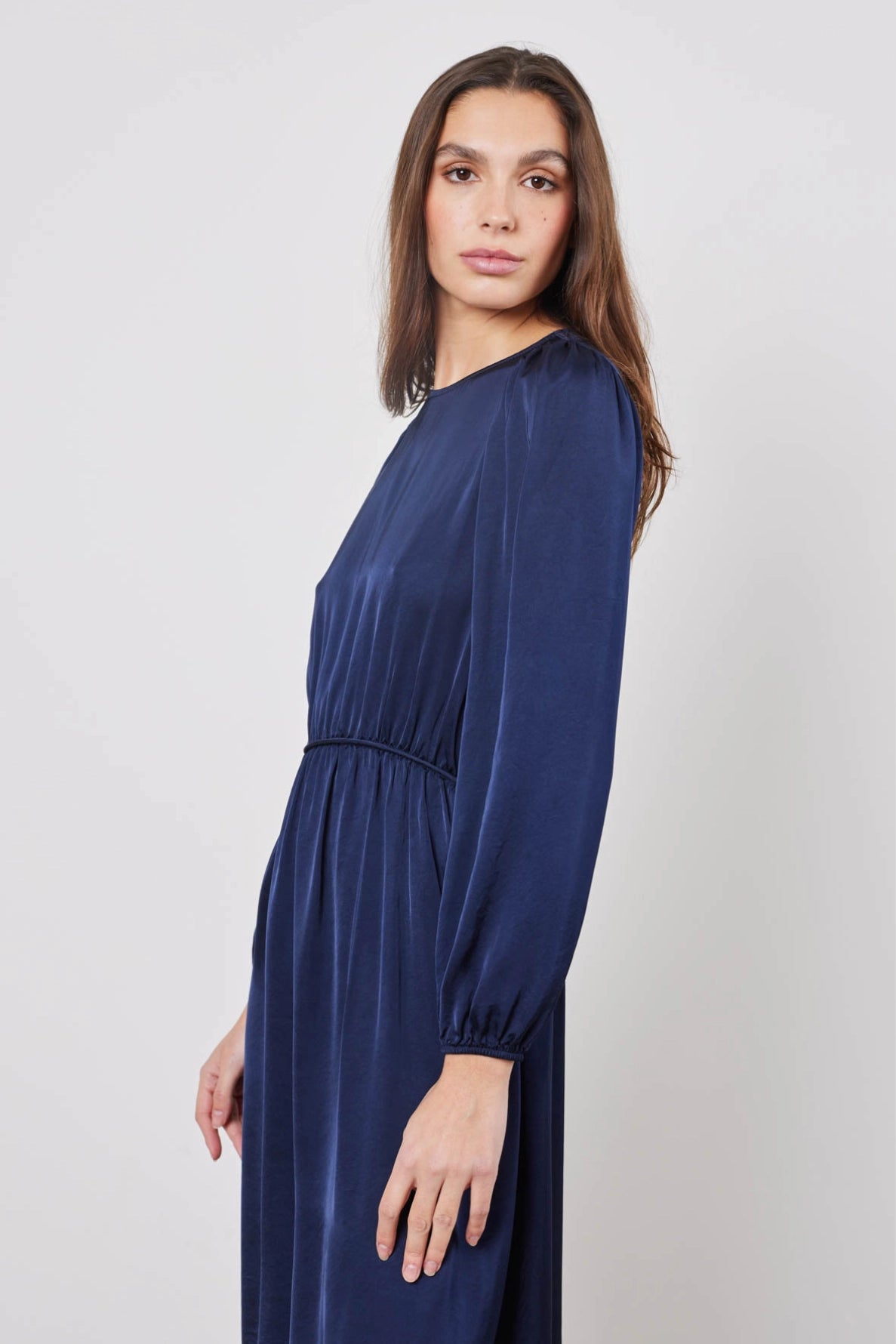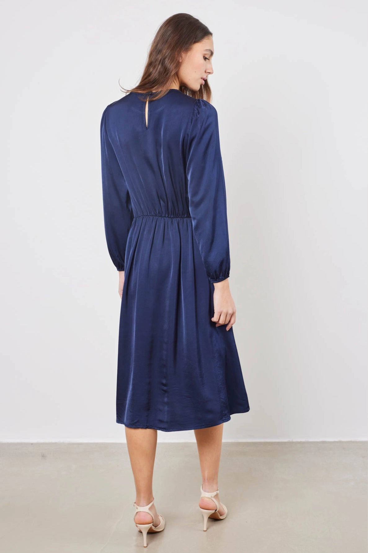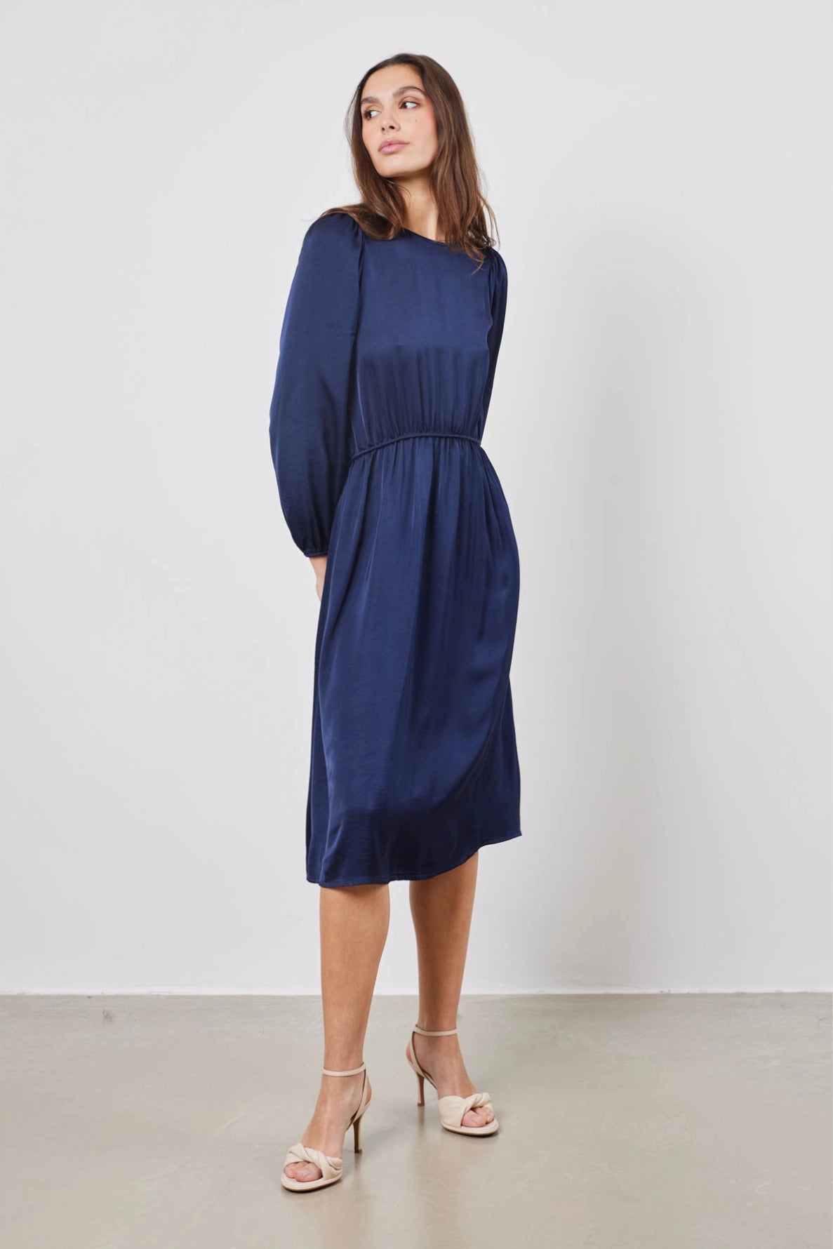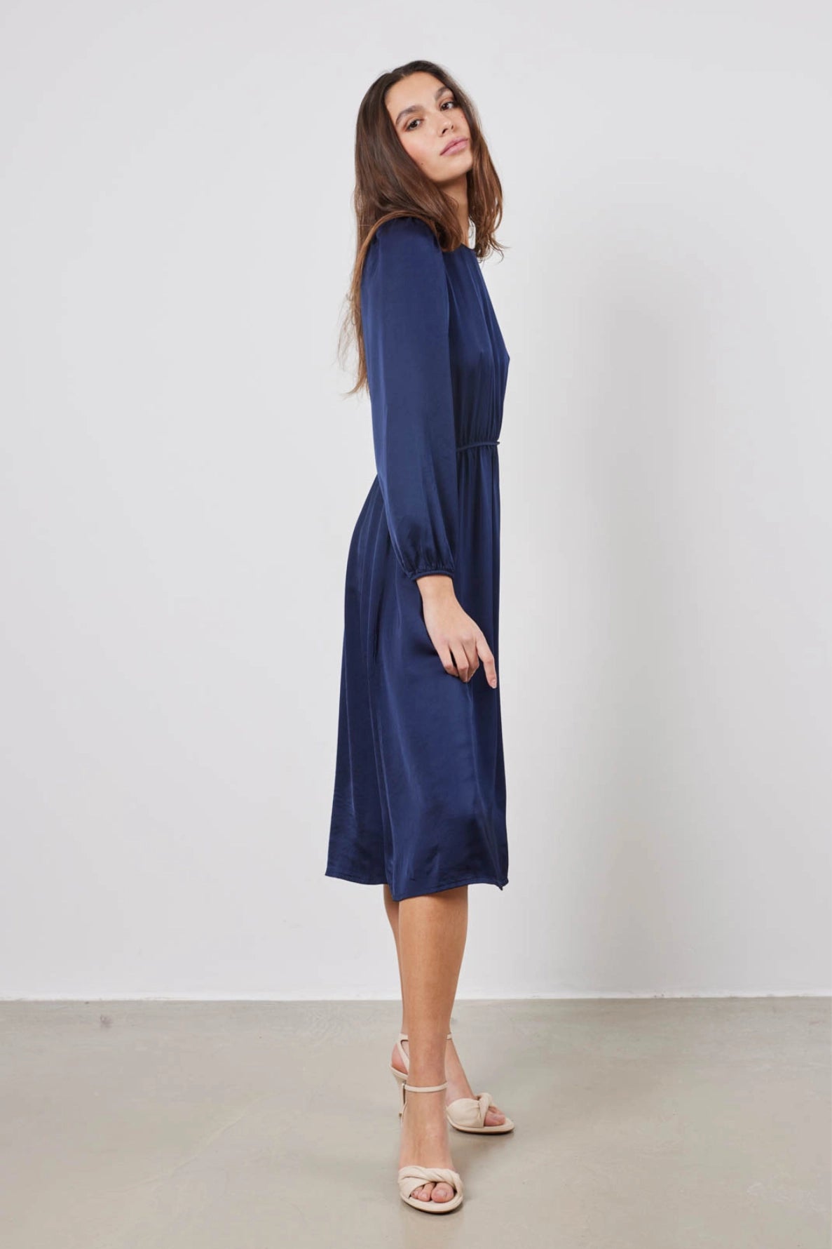 Elegante satijnen jurk met een soepele valling, perfect voor een verfijnde en glamoureuze look bij elke gelegenheid.