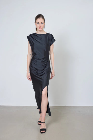 Omarm tijdloze elegantie met de Christelle-jurk, een satijnen jurk perfect voor de feestdagen. De soepele stof zorgt voor een verfijnde touch, terwijl de plooien aan de zijkant een flatterend asymmetrisch effect creëren.