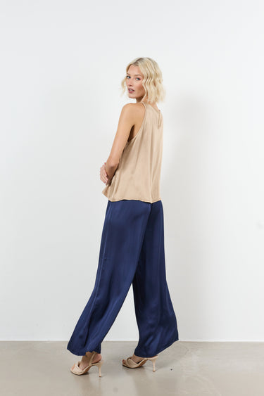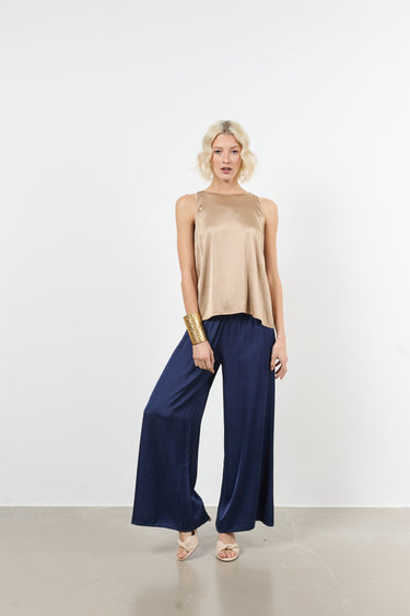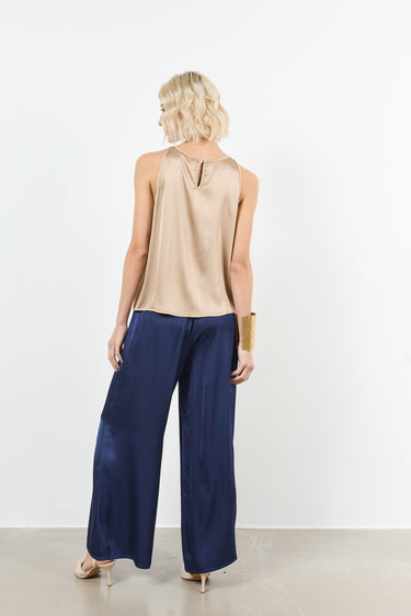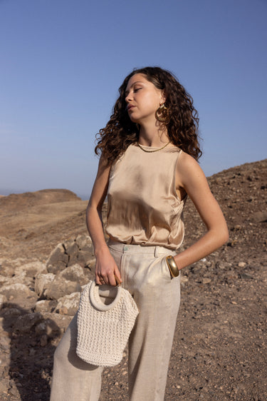 Een soepel vallende tanktop van satijn, die elegantie en eenvoud combineert om uw zomeroutfits of chique avonden te verfraaien.