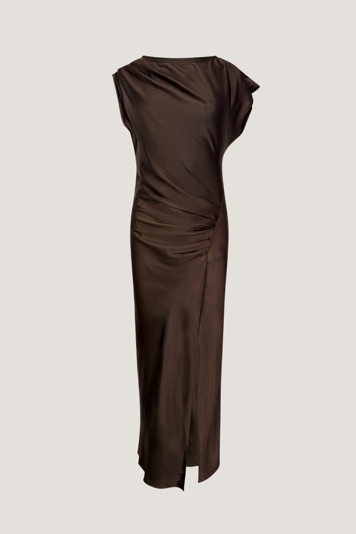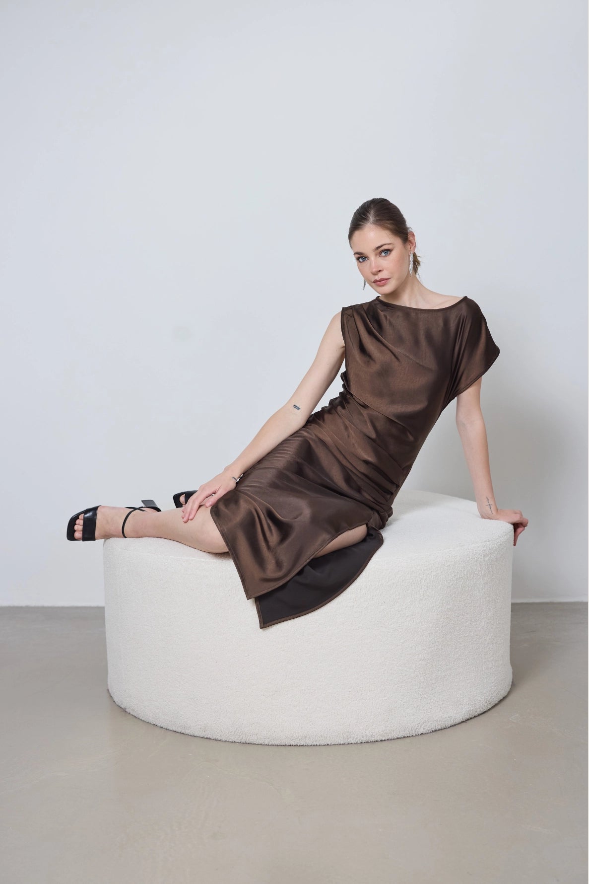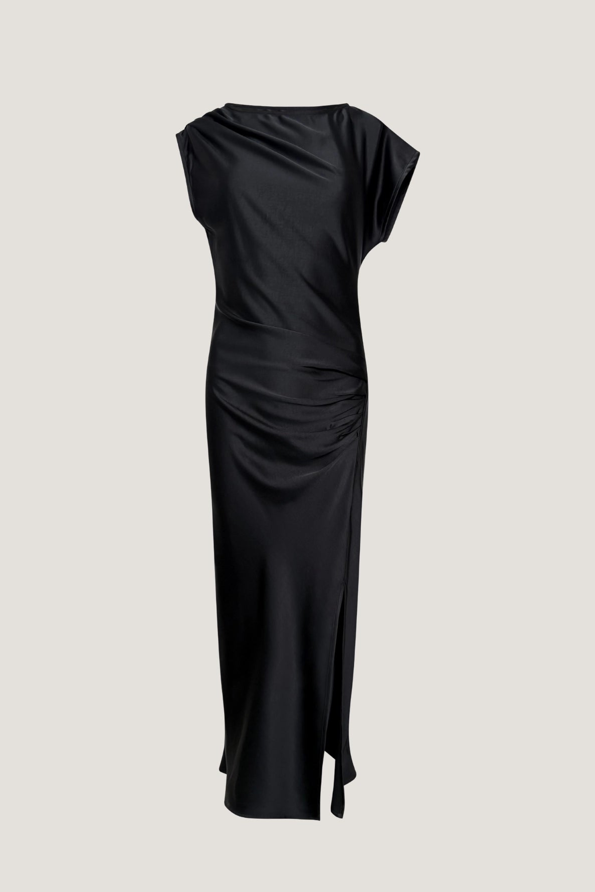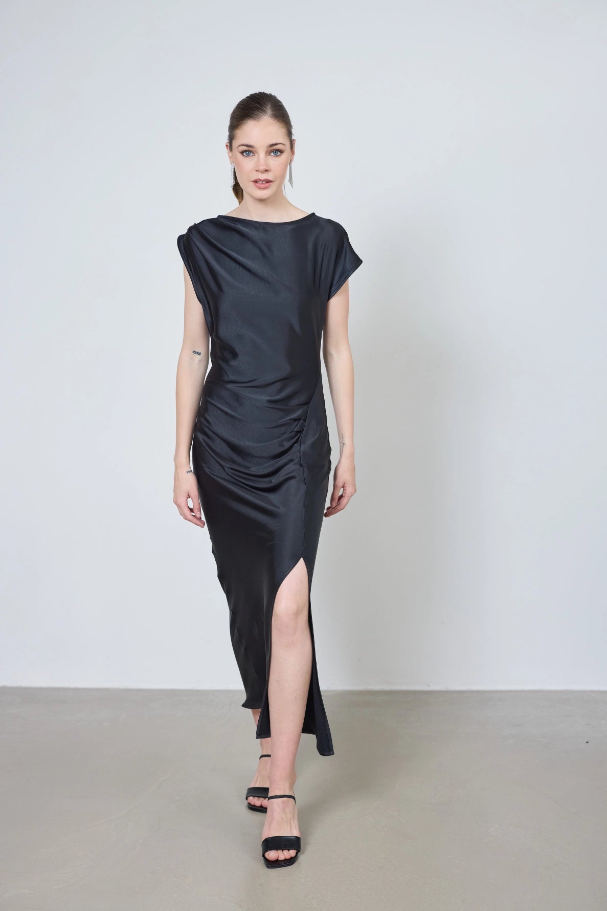 Misez sur l’élégance intemporelle avec la robe Christelle, une robe satinée parfaite pour les fêtes de fin d’année. Son tissu fluide apporte une touche sophistiquée, tandis que les plis sur le côté créent un effet asymétrique flatteur.