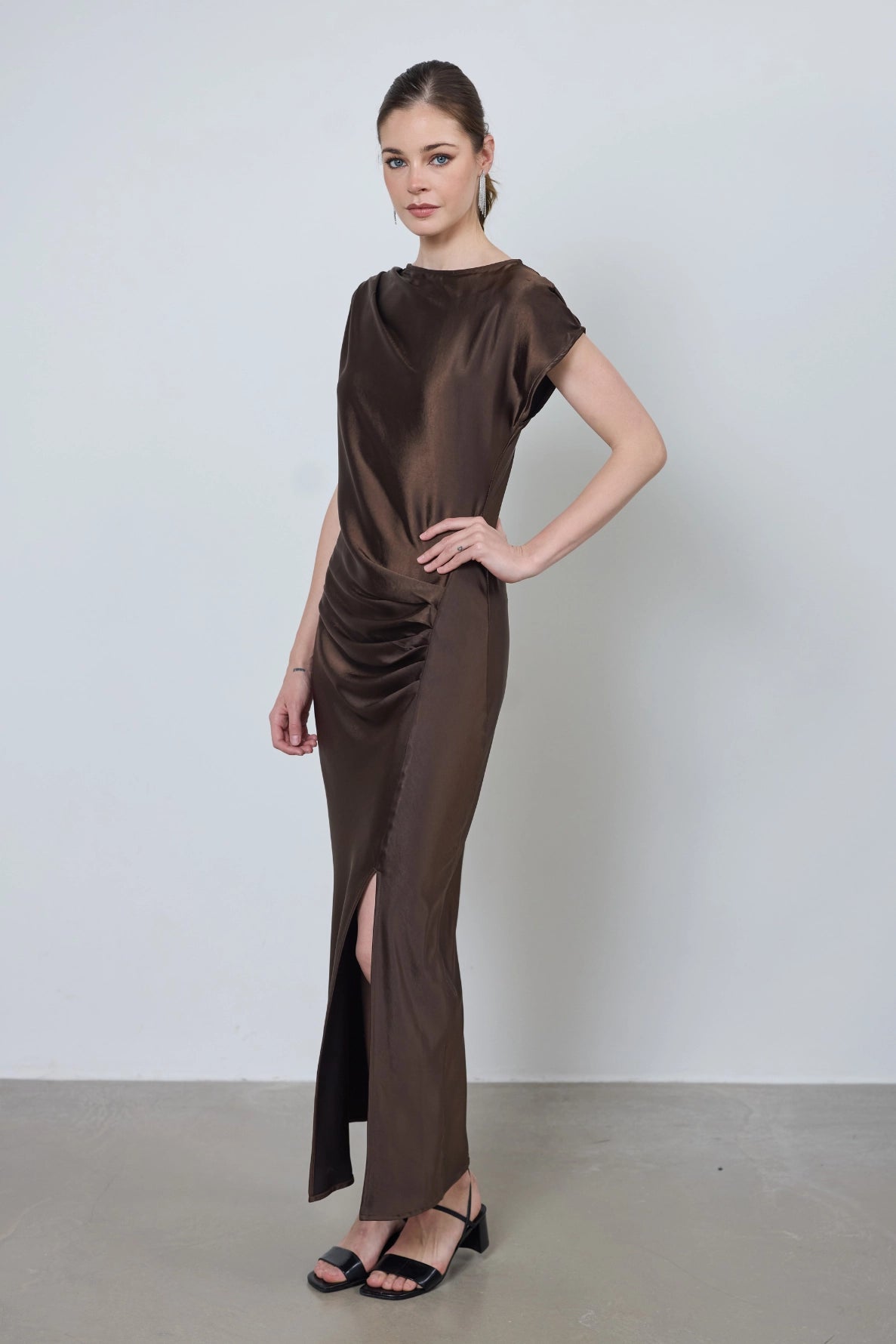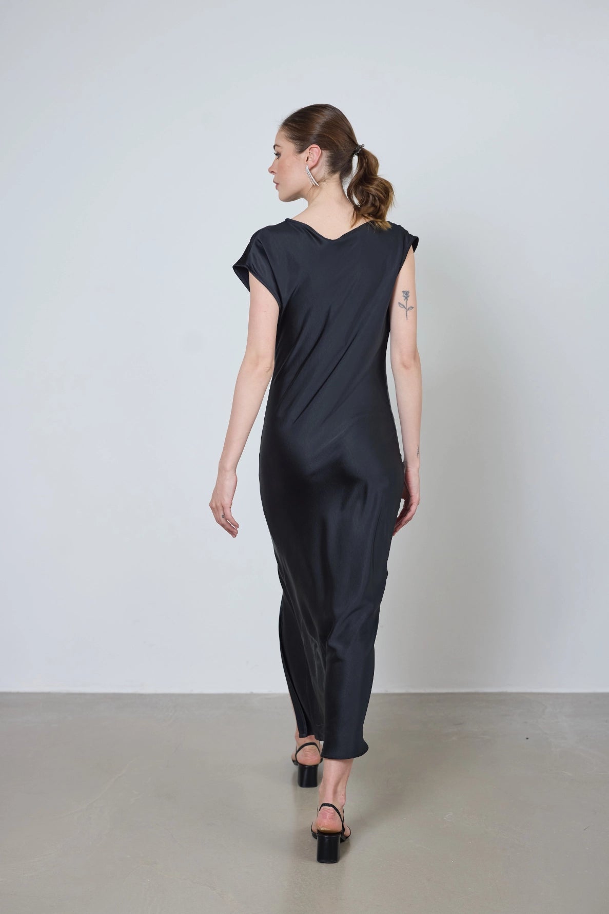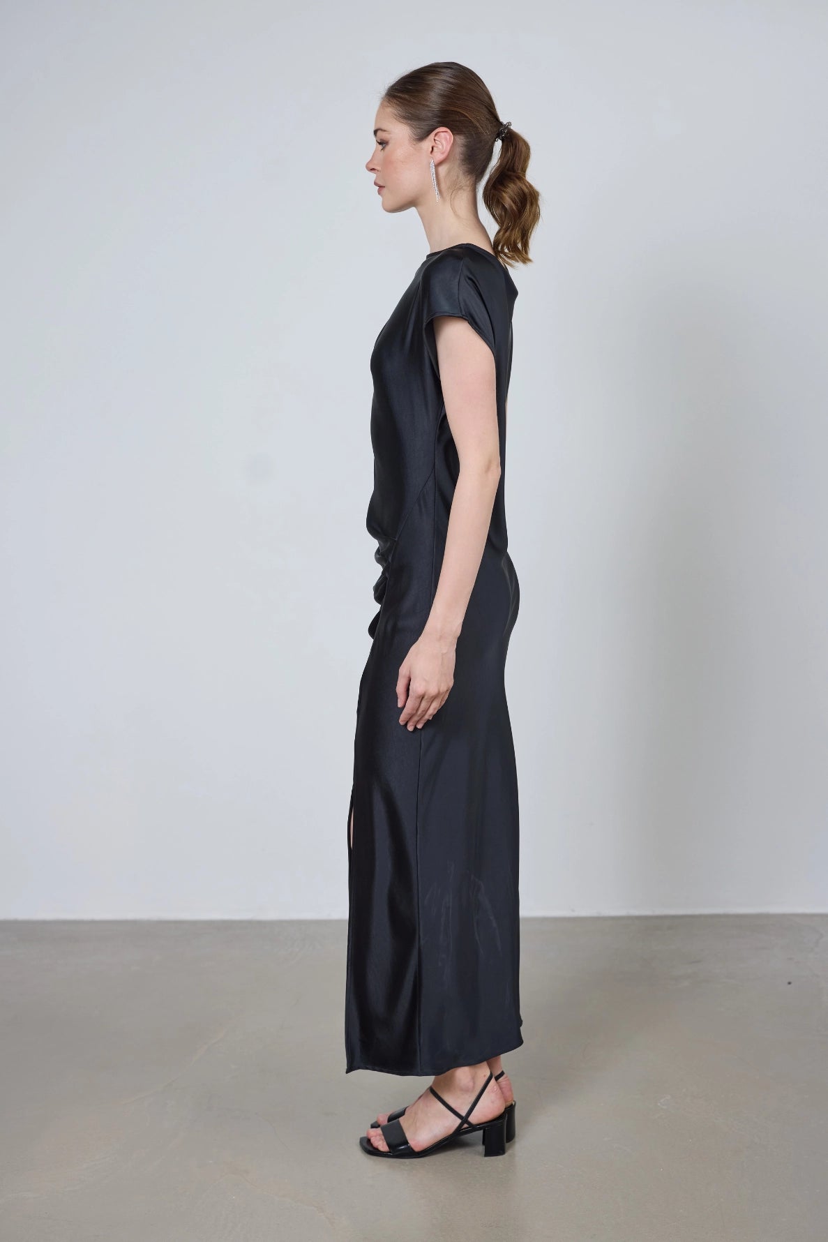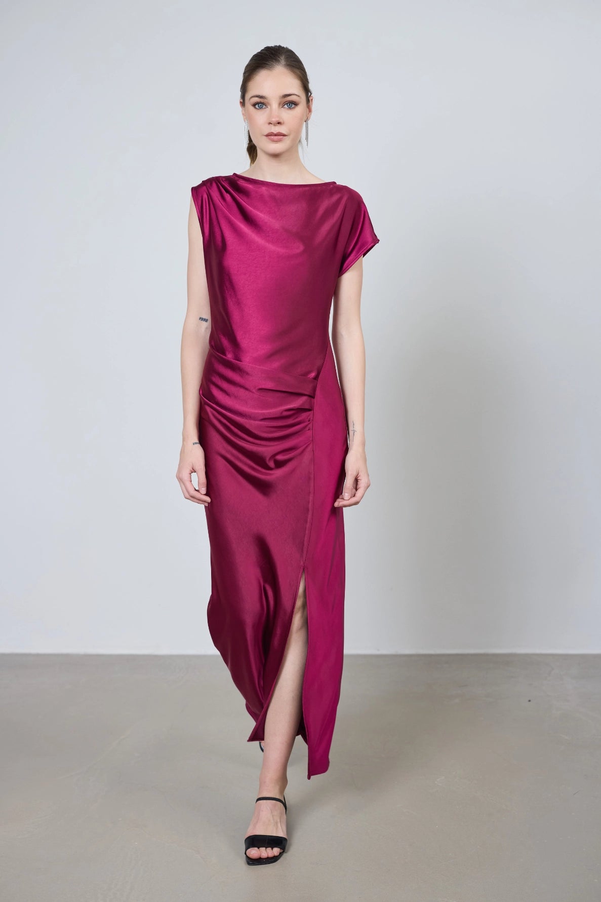 Misez sur l’élégance intemporelle avec la robe Christelle, une robe satinée parfaite pour les fêtes de fin d’année. Son tissu fluide apporte une touche sophistiquée, tandis que les plis sur le côté créent un effet asymétrique flatteur.